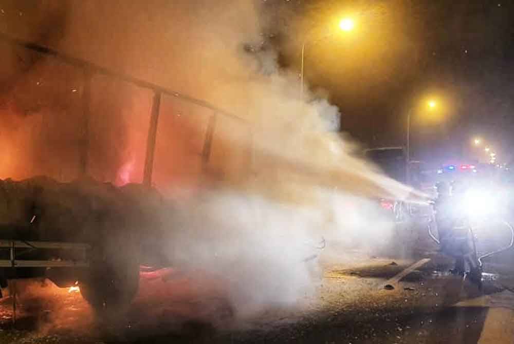 Treler pula terbakar bahagian belakang, tetapi pemandunya selamat tanpa kecederaan. Mangsa cedera dihantar ke hospital dengan jentera EMRS bagi rawatan, manakala mayat diserahkan kepada pihak polis untuk tindakan susulan..