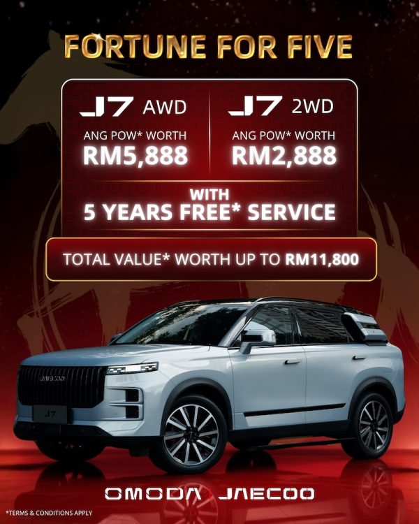 - JAECOO J7 AWD: Ang Pow RM5,888 + 5 tahun servis percuma (bernilai RM11,800)*