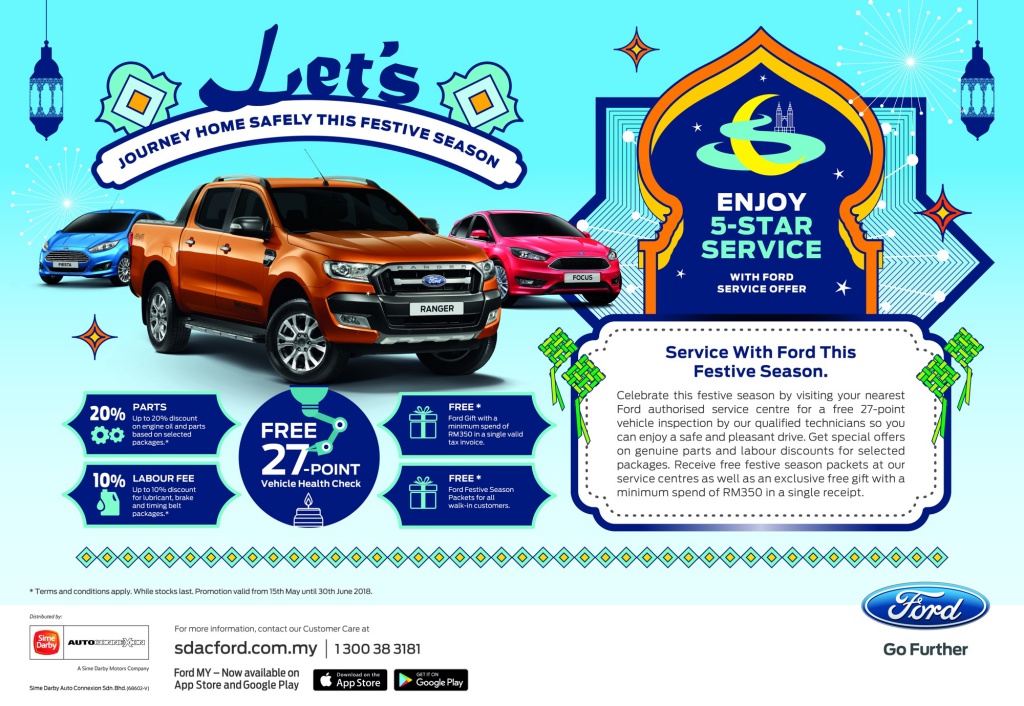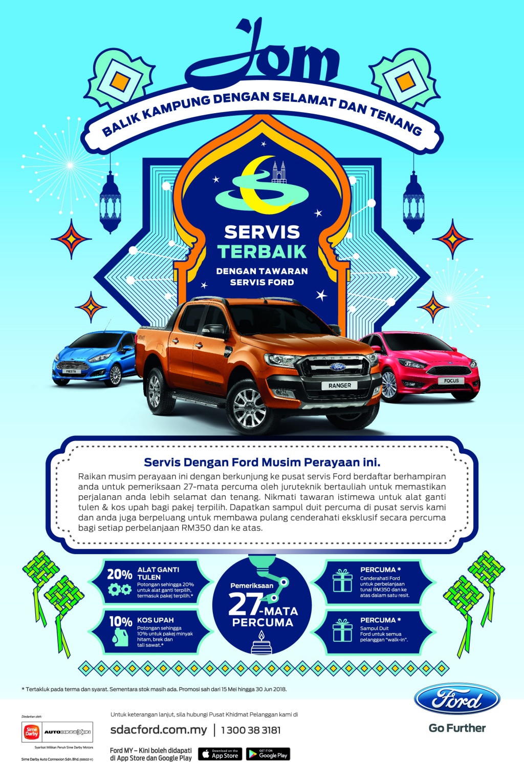 SIME Darby Auto Connexion (SDAC) selaku pengedar tunggal kenderaan Ford di Malaysia melancarkan promosi servis seluruh negara bagi memastikan perjalanan pulang ke kampung selamat dan tenang sempena sambutan Hari Raya Aidilfitri nanti. Kempen Servis Raya Ford itu, yang membabitkan pemeriksaan 27 poin percuma, sudahpun bermula dan bakal berakhir pada 30 Jun depan..