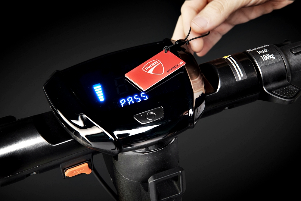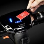 - Model ini perlu dihidupkan menggunakan teknologi NFC. Pengguna perlu bawa sekeping kad kecil atau token pada paparan hendal untuk menghidupkan skuter.