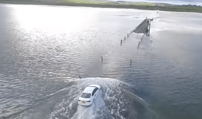 Kereta putih tersebut dipandu seorang pemandu Uber bersama penumpangnya. Pemandu itu kelihatan dapat merentasi laluan tambak yang sedang digenangi air sebelum berhenti di tengah laluan yang masih lagi kering. Sebaik saja menghentikan kereta, seluruh laluan tambak mula dipenuhi air pasang, sekali gus memutuskan akses ke tanah besar.