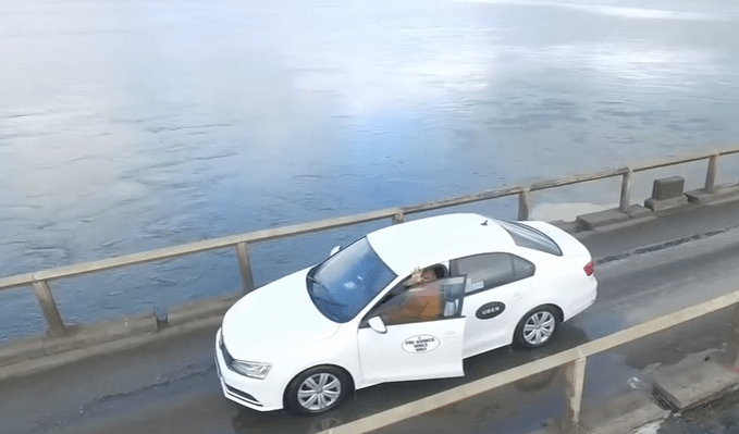 Penumpang Uber kelihatan membuka pintu dan melambai kepada kamera dron Bradshaw. Tidak lama kemudian, petugas keselamatan yang sememangnya sudah biasa dengan insiden seumpama itu tiba untuk menyelamatkan mereka berdua.