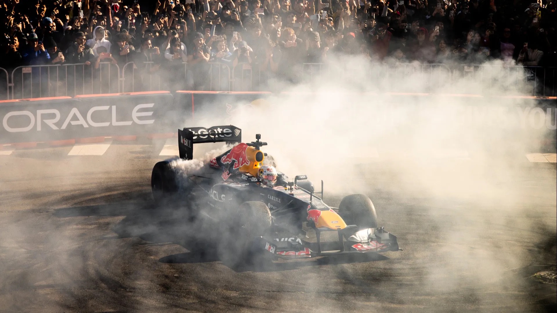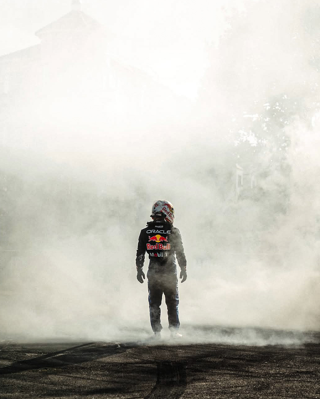 Sebelum api marak, Tsunoda sempat menghiburkan penonton dengan aksi pusingan tayar berasap tebal, simbolik kepada karakter agresif jentera V8 era tersebut.