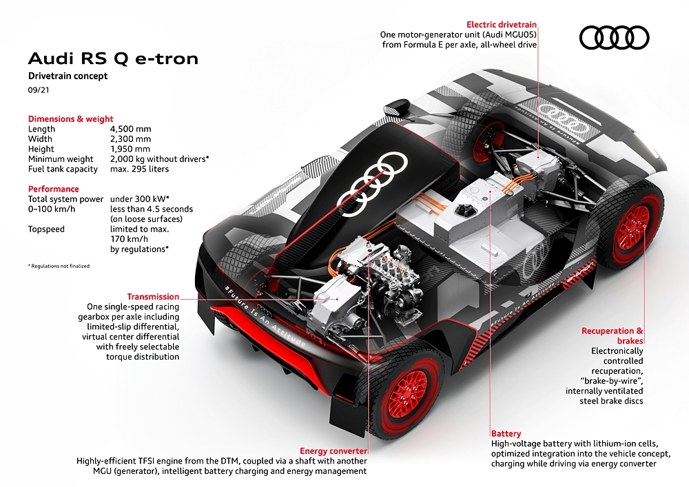 RS Q E-Tron yang tampil seperti pesawat makhluk asing itu dijana enjin TFSI dan bateri 50kWh berserta dua motor elektrik pada setiap gandar. Enjin daripada model DTM itu berfungsi sebagai generator, manakala motor elektrik diambil daripada jentera lumba Formula E.