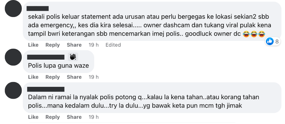 Klip video itu menjadi medan debat antara netizen yang mempersoalkan kenderaan peronda polis memotong ‘Q’ di kawasan simpang dan netizen yang mempertahankan tindakan tersebut. Berikut antara komen diberikan: