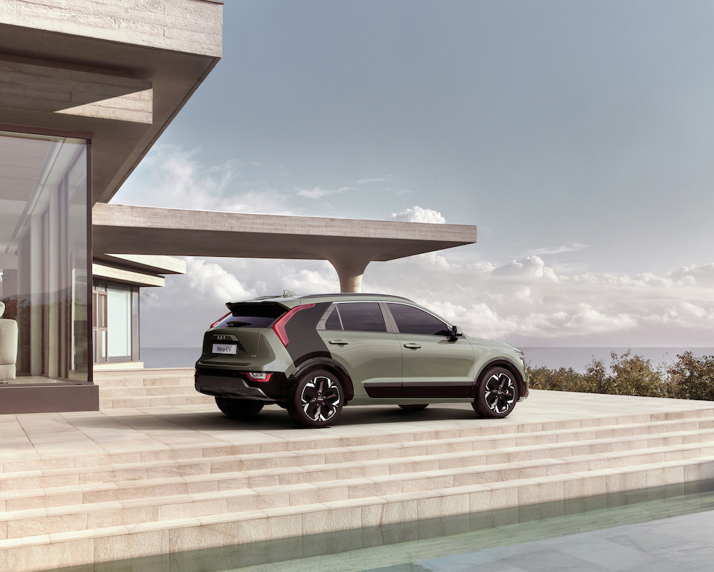 Lampu LED belakang direka dalam bentuk bumerang, dan dihiasi unit spoiler dan difuser. Ciri menarik lain luaran Kia Niro EV (2023) ialah Active Air Flap dalam gril yang membantu aspek pekali seretan (drag coefficient) pada angka 0.29 Cd.