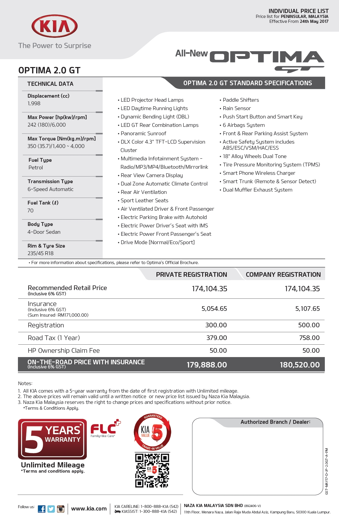 Harga atas jalan Kia Optima GT ialah RM179,888.