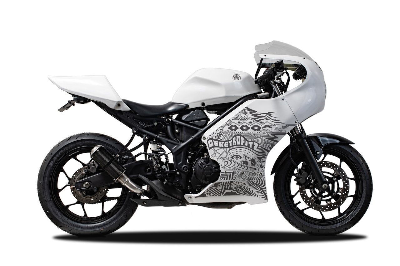 Jika dipasang, kit badan itu akan mengubah keseluruhan gaya sportbike anda, daripada penunggang R3 moden kepada pelumba jalanan gaya 1960-an. Dari jauh nampak seperti BMW RnineT Racer. Beberapa elemen cool ditampilkan dengan saiz fairing kompak, ringkas dan padat, termasuk lampu utama tunggal bentuk bulat dan pelana tunggal.