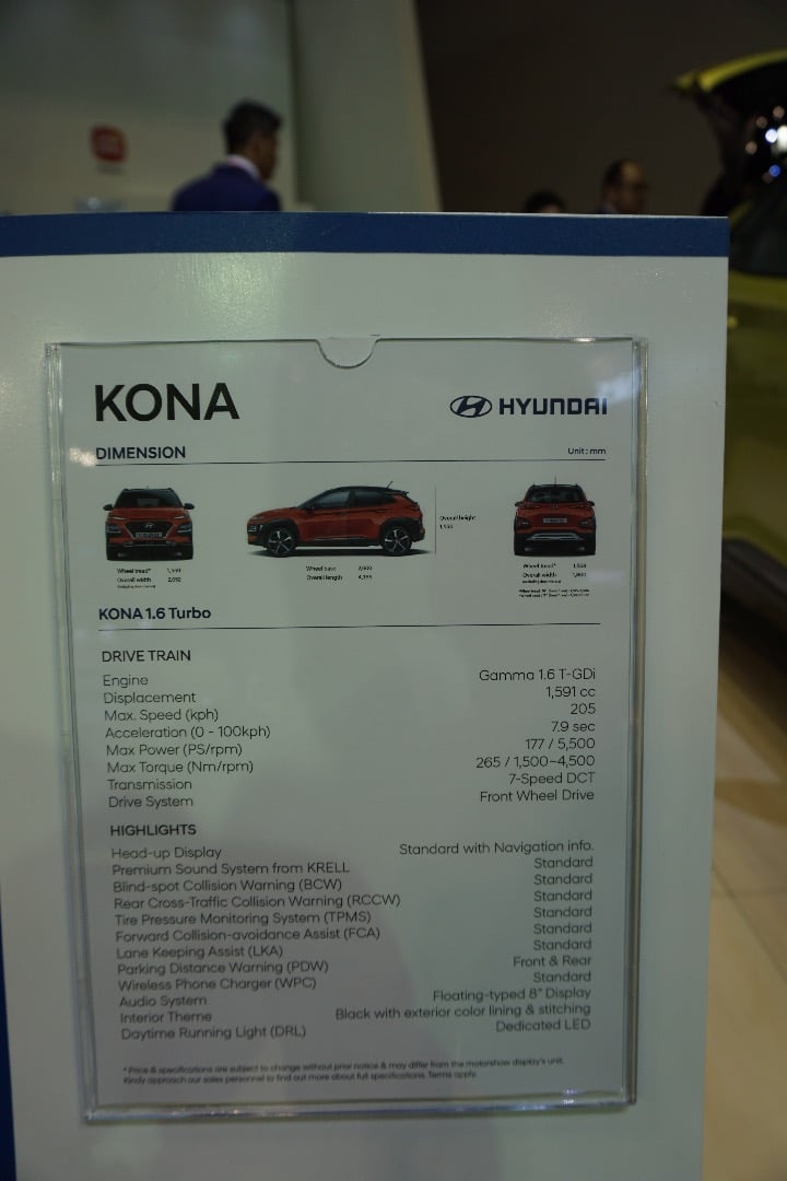 Berikut spesifikasi Kona 1.6 Turbo yang ditayangkan sepanjang KLIMS 2018 dan dikatakan versi premium yang bakal dibawa masuk ke Malaysia, tahun depan: