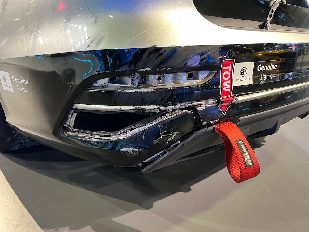 - Bampar belakang sebelah kiri juga pecah mungkin akibat pelanggaran.