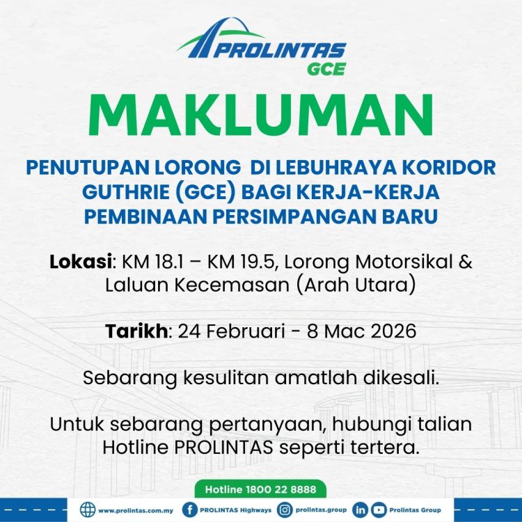 Dengan dua kerja berasingan berlangsung serentak di sekitar KM18 arah utara, pengguna laluan GCE khususnya yang berulang-alik ke Shah Alam dan Rawang disaran mempertimbangkan masa perjalanan bagi mengelakkan kelewatan.
