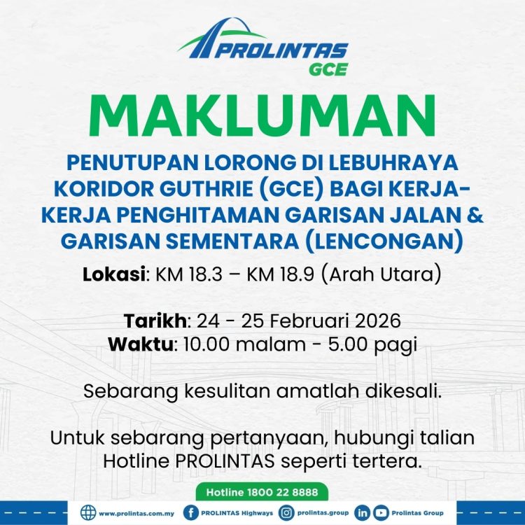 Kerja-kerja penghitaman garisan jalan dan pemasangan garisan sementara (lencongan) akan dijalankan pada 24 hingga 25 Februari 2026, dari jam 10 malam hingga 5 pagi.
