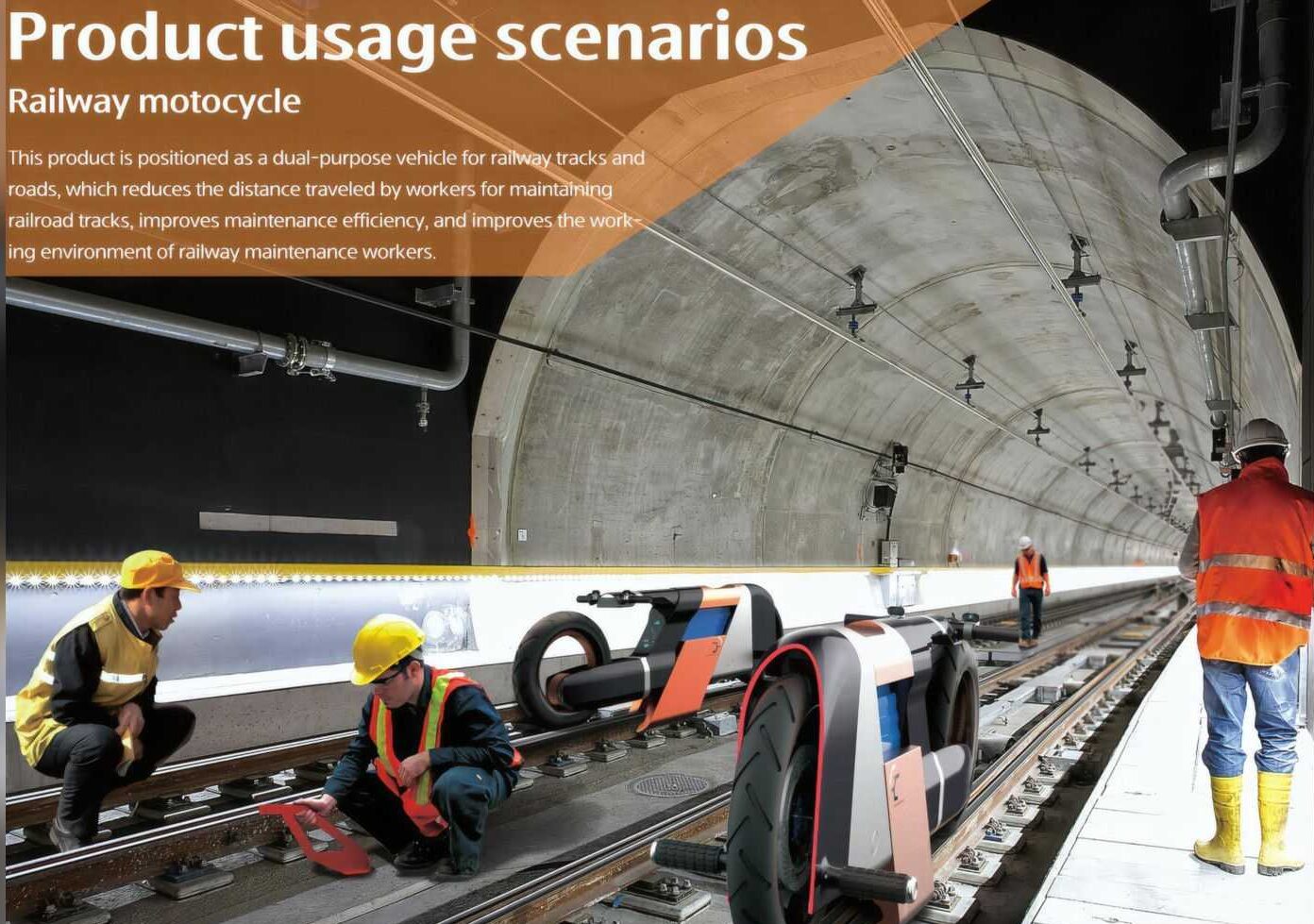 Model konsep Motosikal Landasan boleh diubah daripada motosikal elektrik jalanan kepada jentera rel dengan sedikit pengubahsuaian.