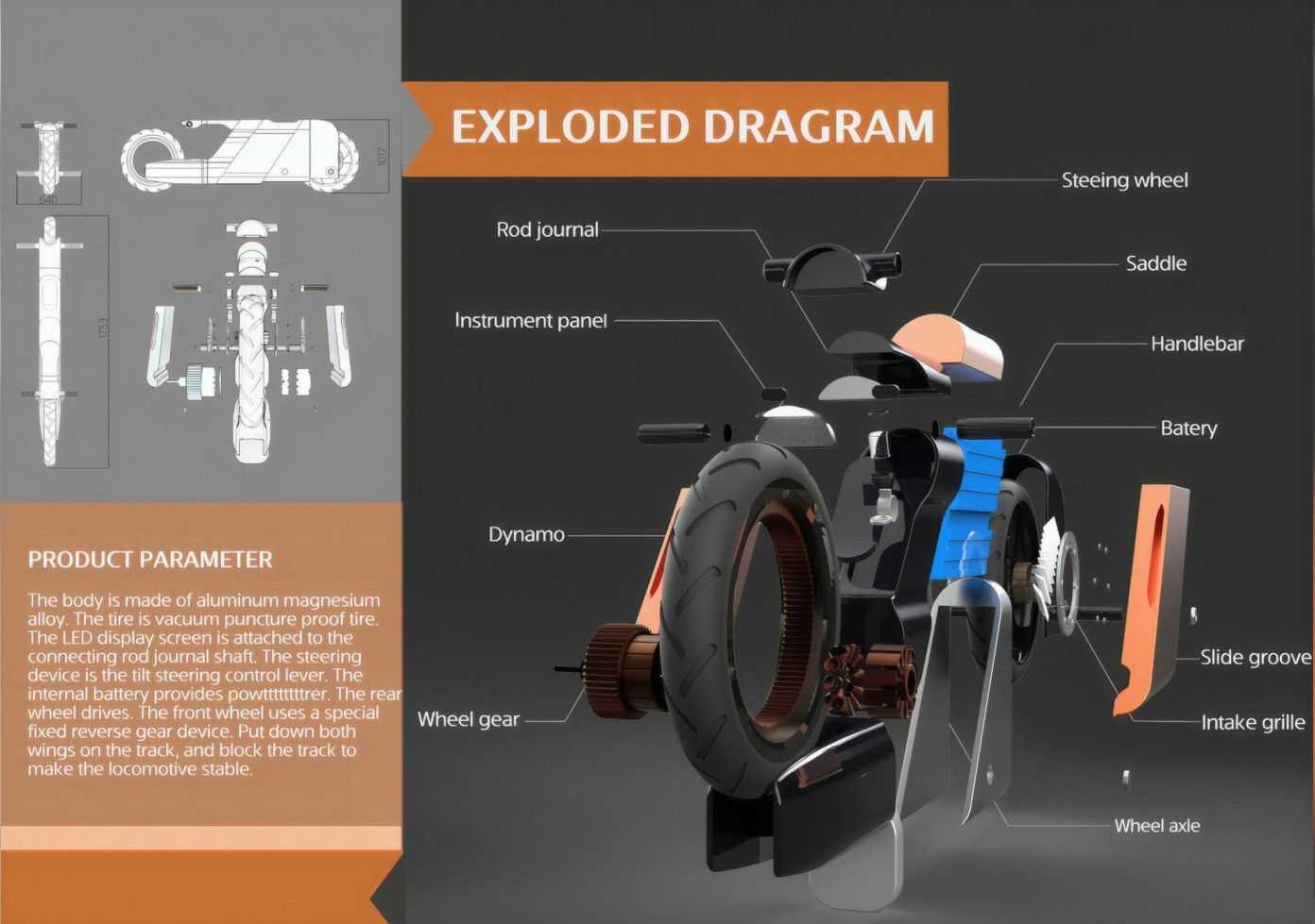 Berdasarkan rekabentuk dihasilkan, motosikal elektrik tersebut menggunakan panel badan tengah unik pada kedua-dua sisi yang membolehkan penunggang memiringkan jentera dan pada masa sama mencengkam rel dengan selamat.
