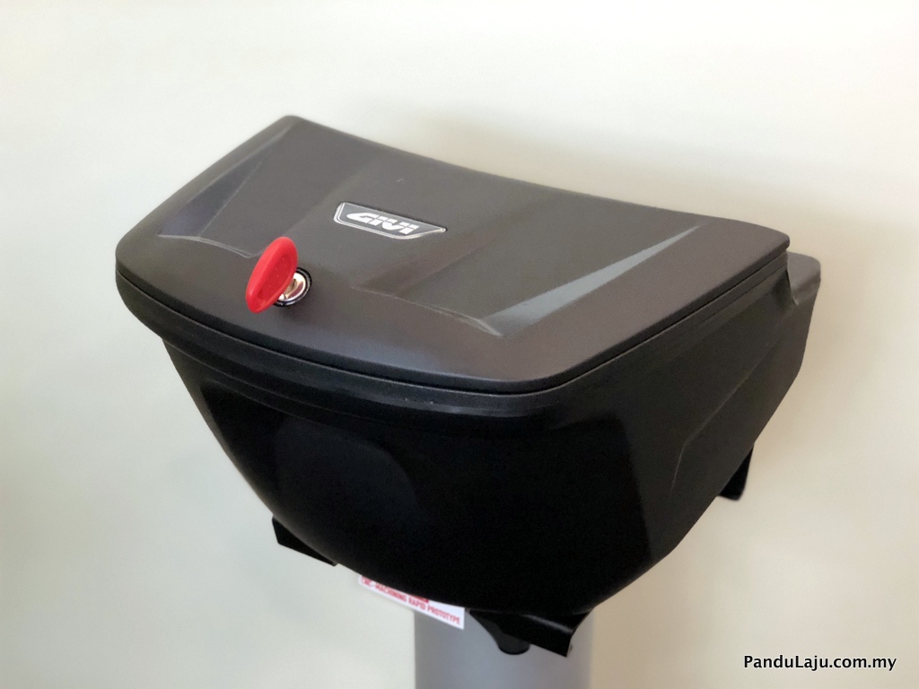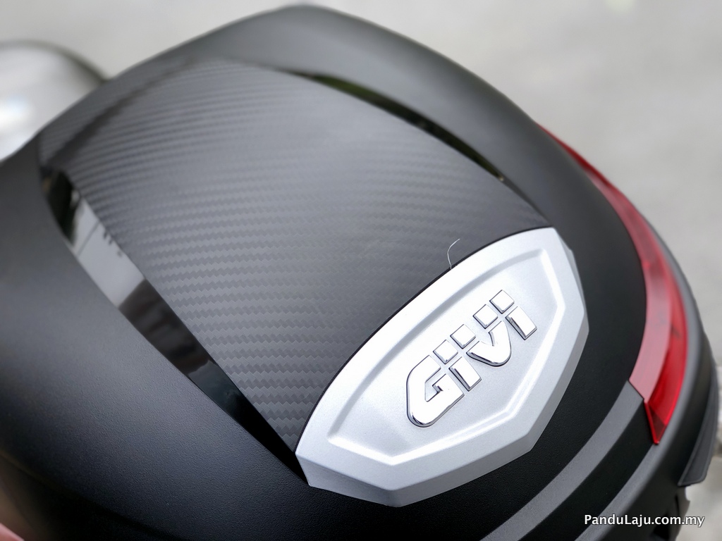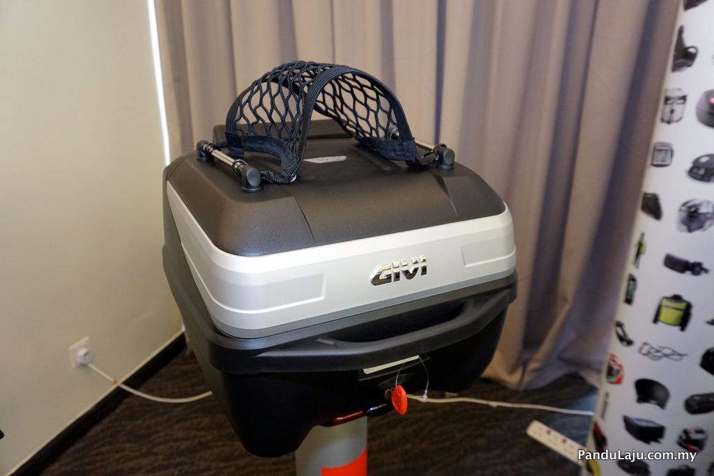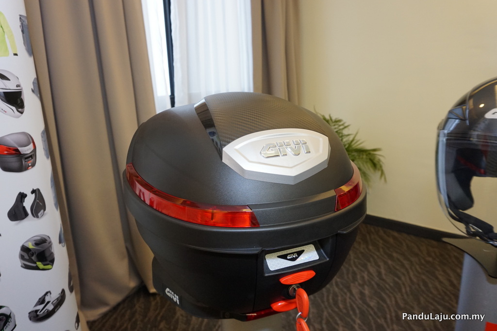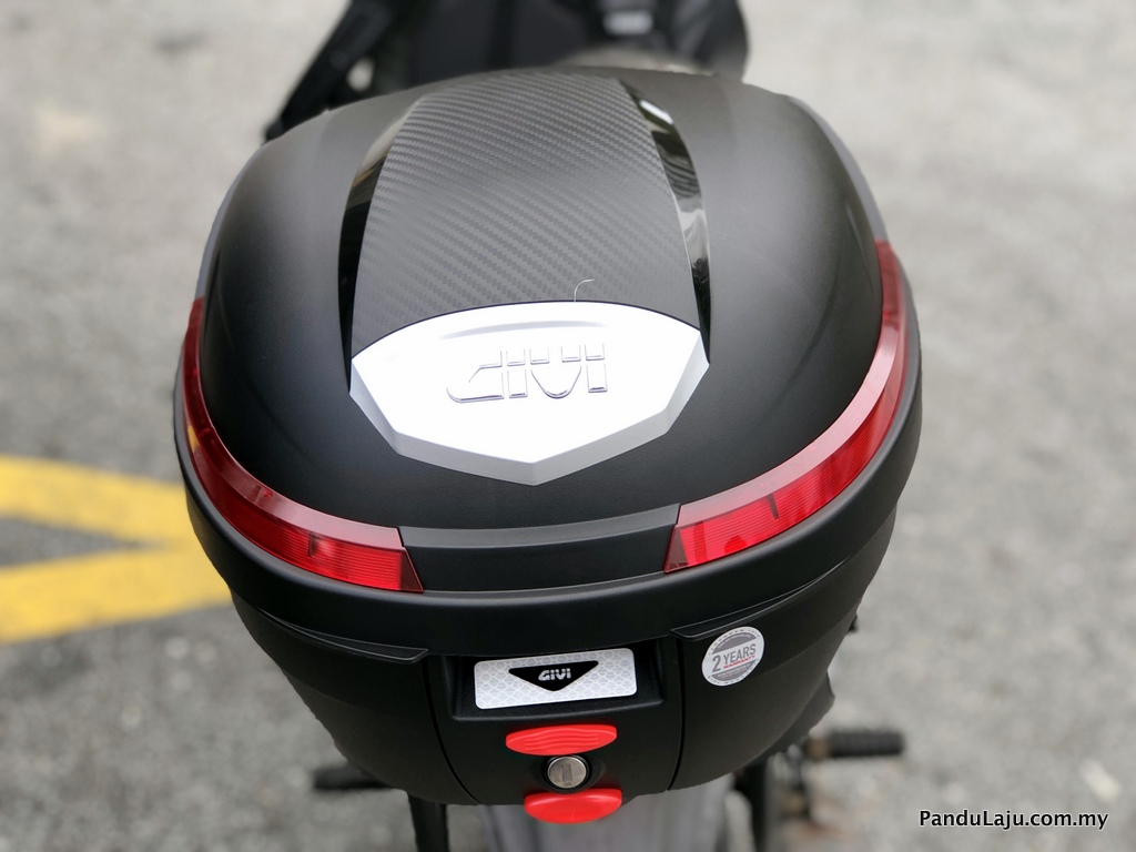 Kotak simpan barang itu, yang berkapasiti 27 liter, dihasilkan di kilang Givi Malaysia, Bukit Beruntung, Rawang dan direka khas untuk penunggang yang mahu tampil ranggi ketika menunggang Ditambah pula kehadiran kemasan gentian karbon pada bahagian atas yang menjadikan ia tampak premium.