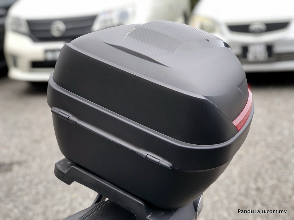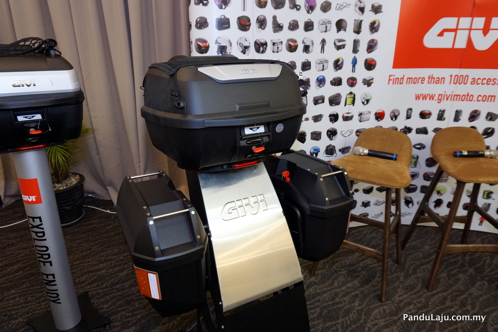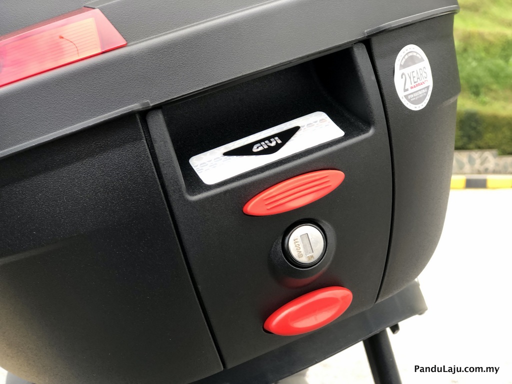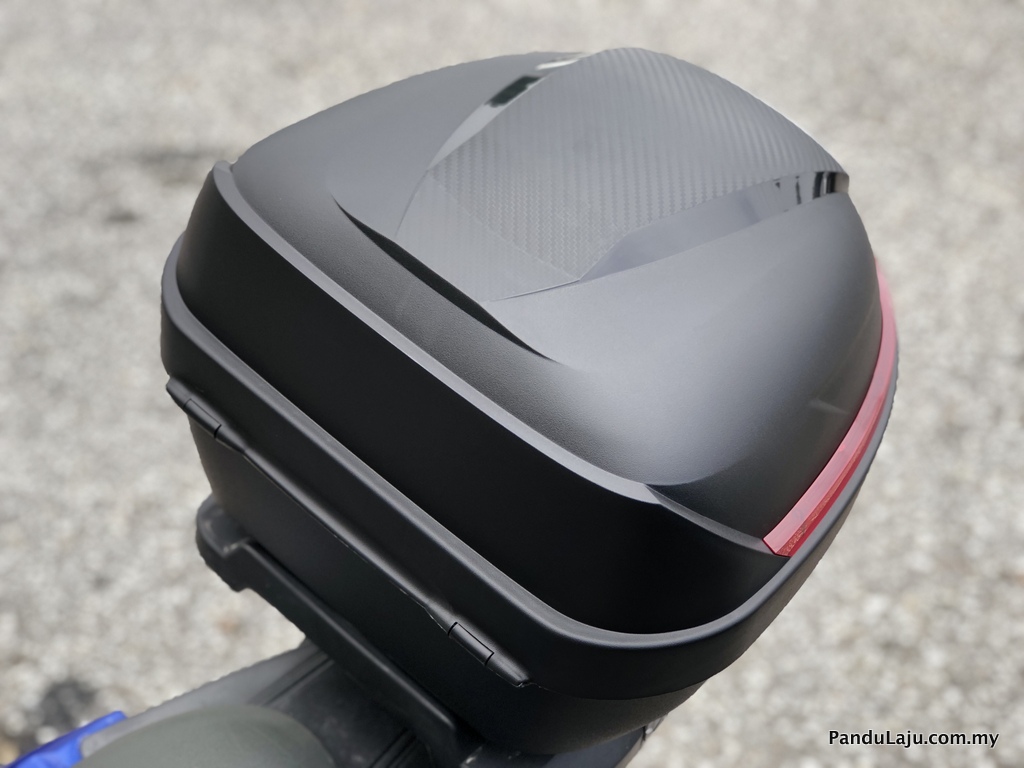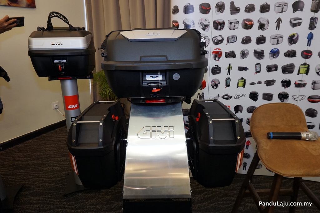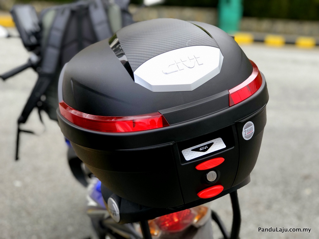 Kotak simpan barang itu, yang berkapasiti 27 liter, dihasilkan di kilang Givi Malaysia, Bukit Beruntung, Rawang dan direka khas untuk penunggang yang mahu tampil ranggi ketika menunggang Ditambah pula kehadiran kemasan gentian karbon pada bahagian atas yang menjadikan ia tampak premium.