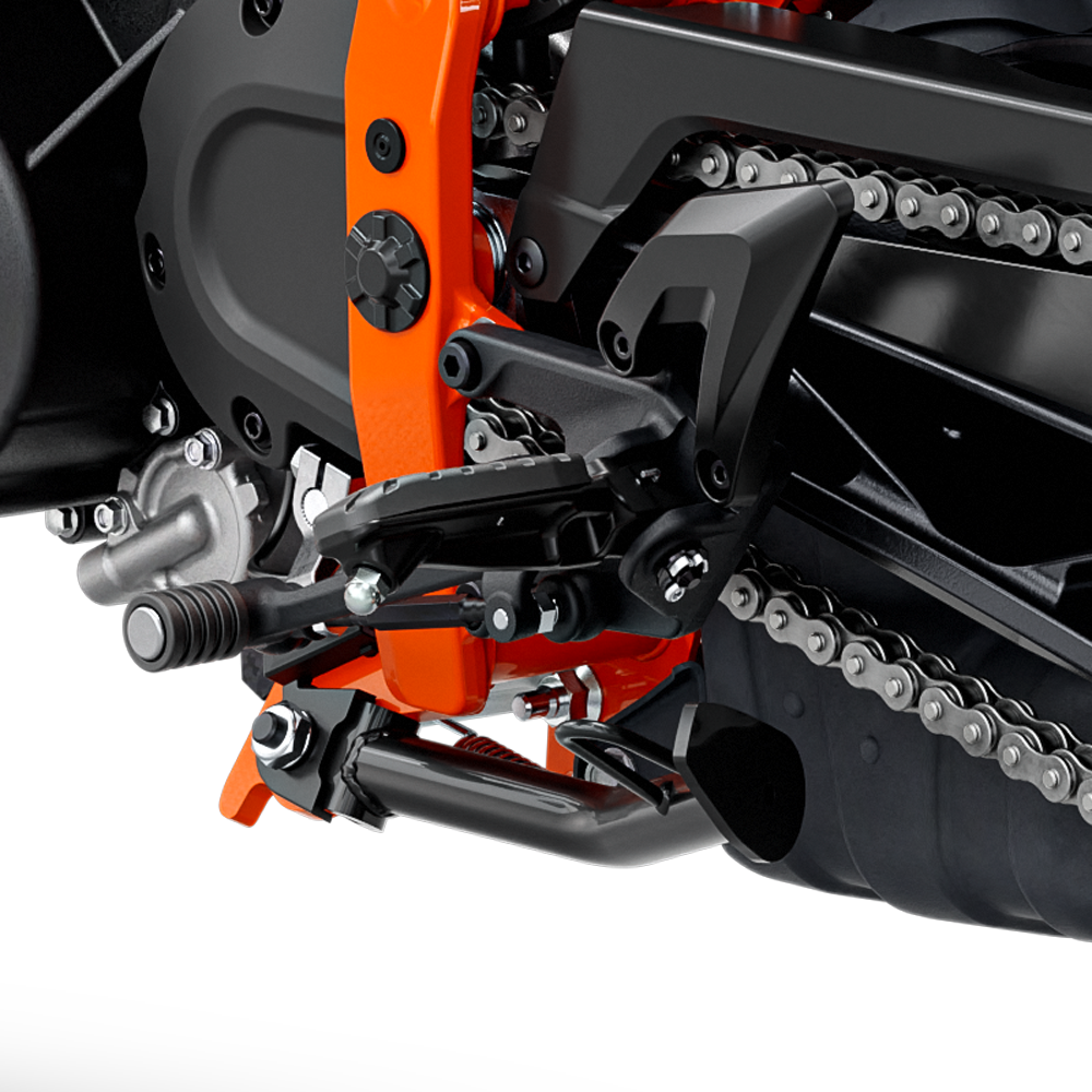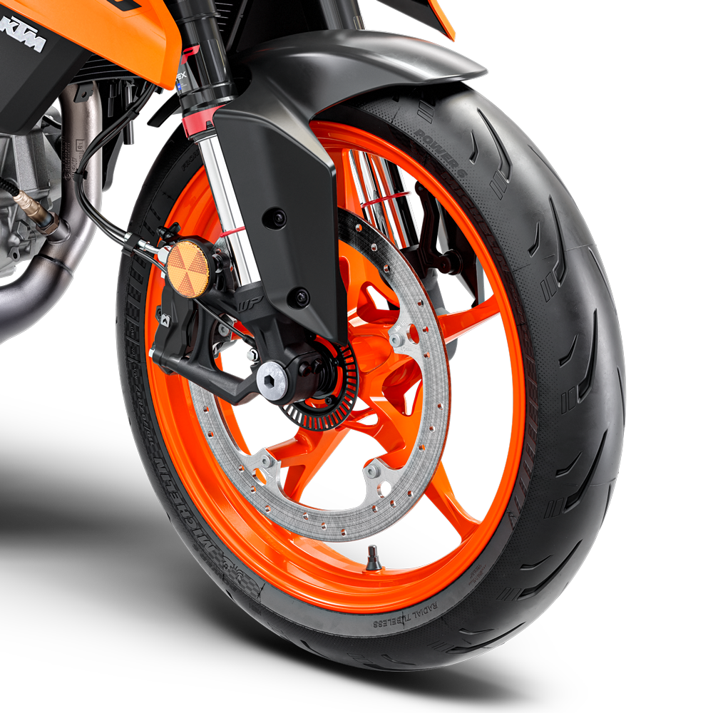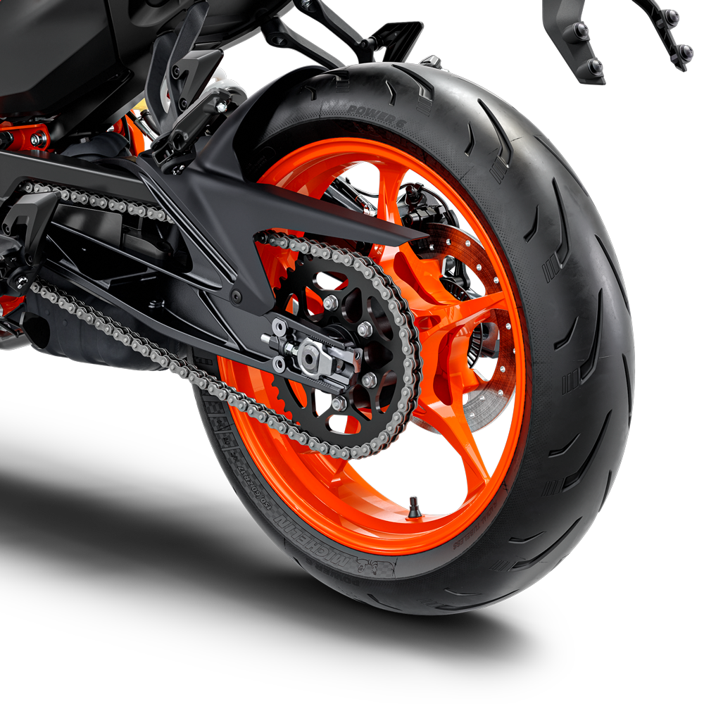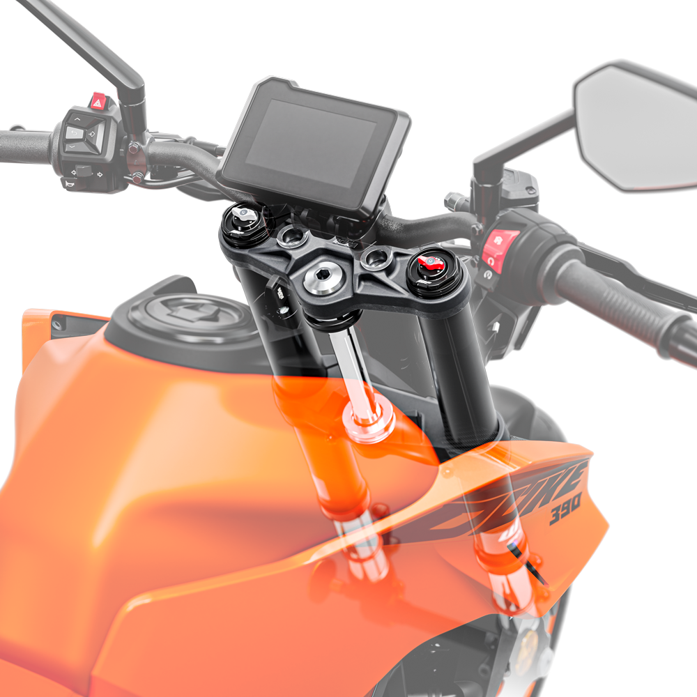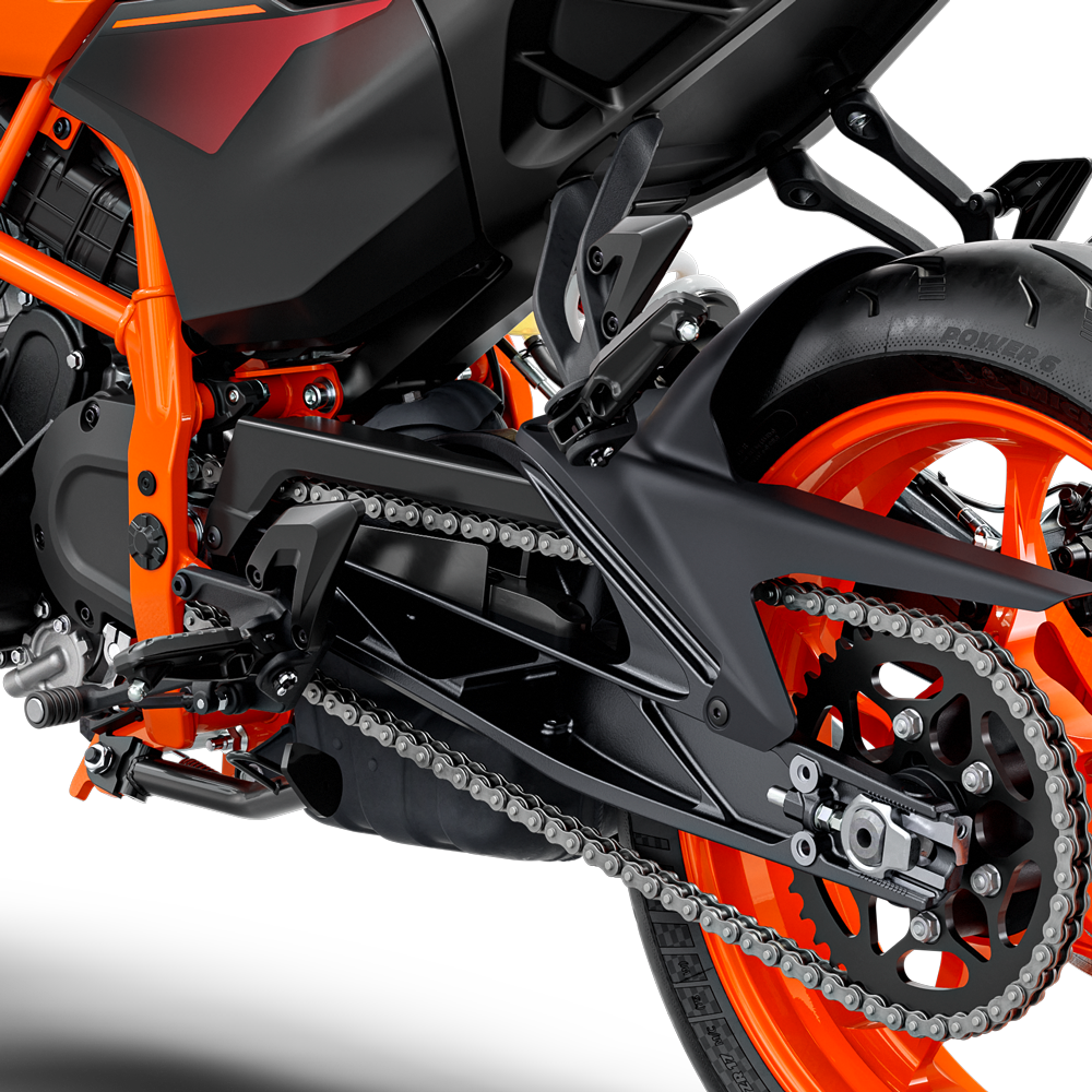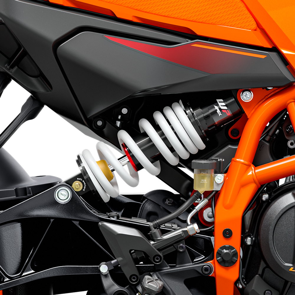 KTM 390 Duke (2024) turut mendapat komponen baharu seperti frem trellis keluli, fork terbalik (USD) 43mm WP Apex 43 boleh laras mampatan dan lantunan di depan, dan monoshock WP Apex boleh laras prabeban dan lantunan di belakang.