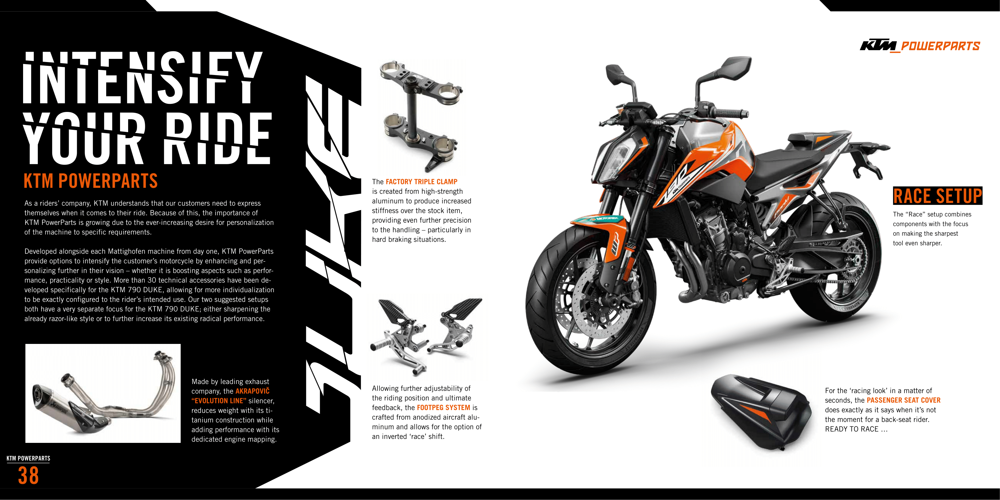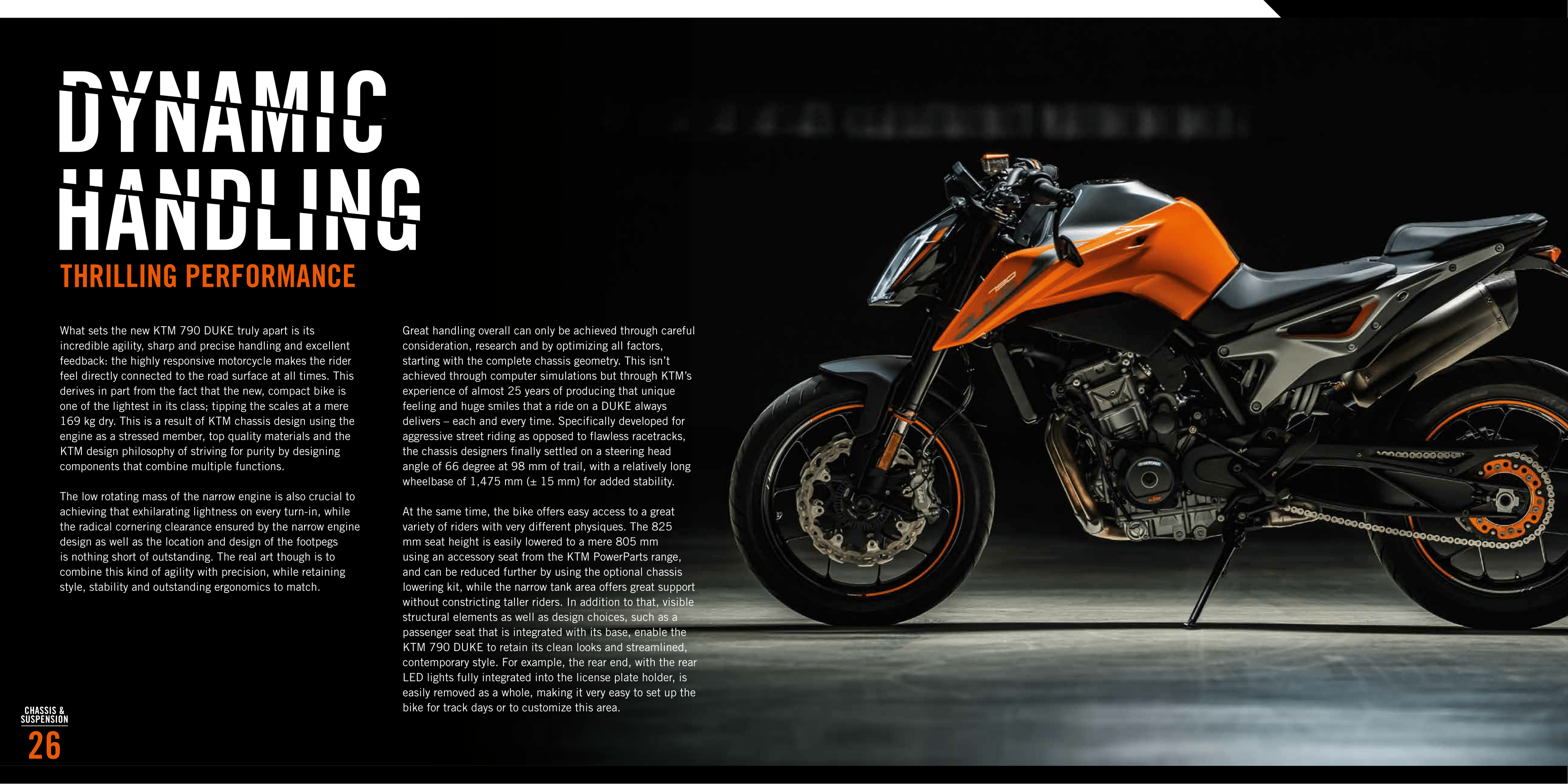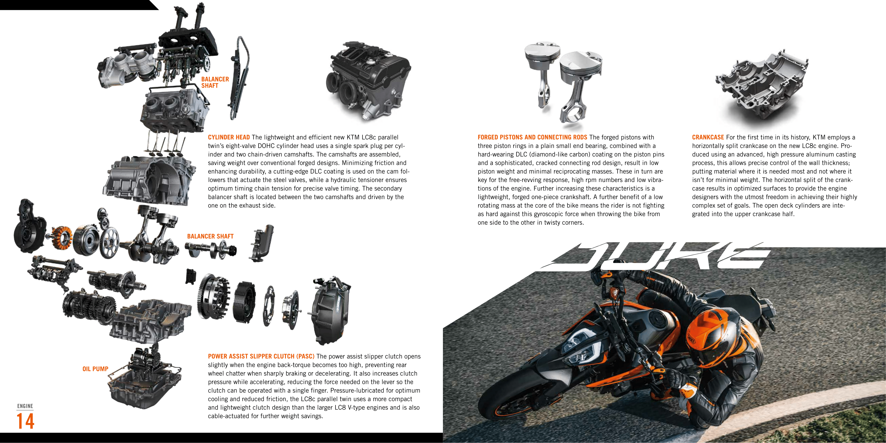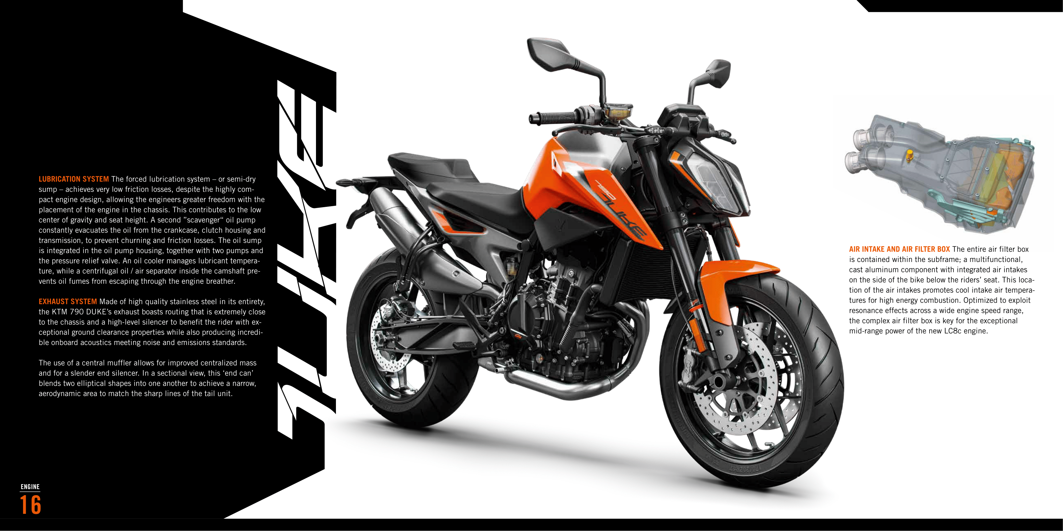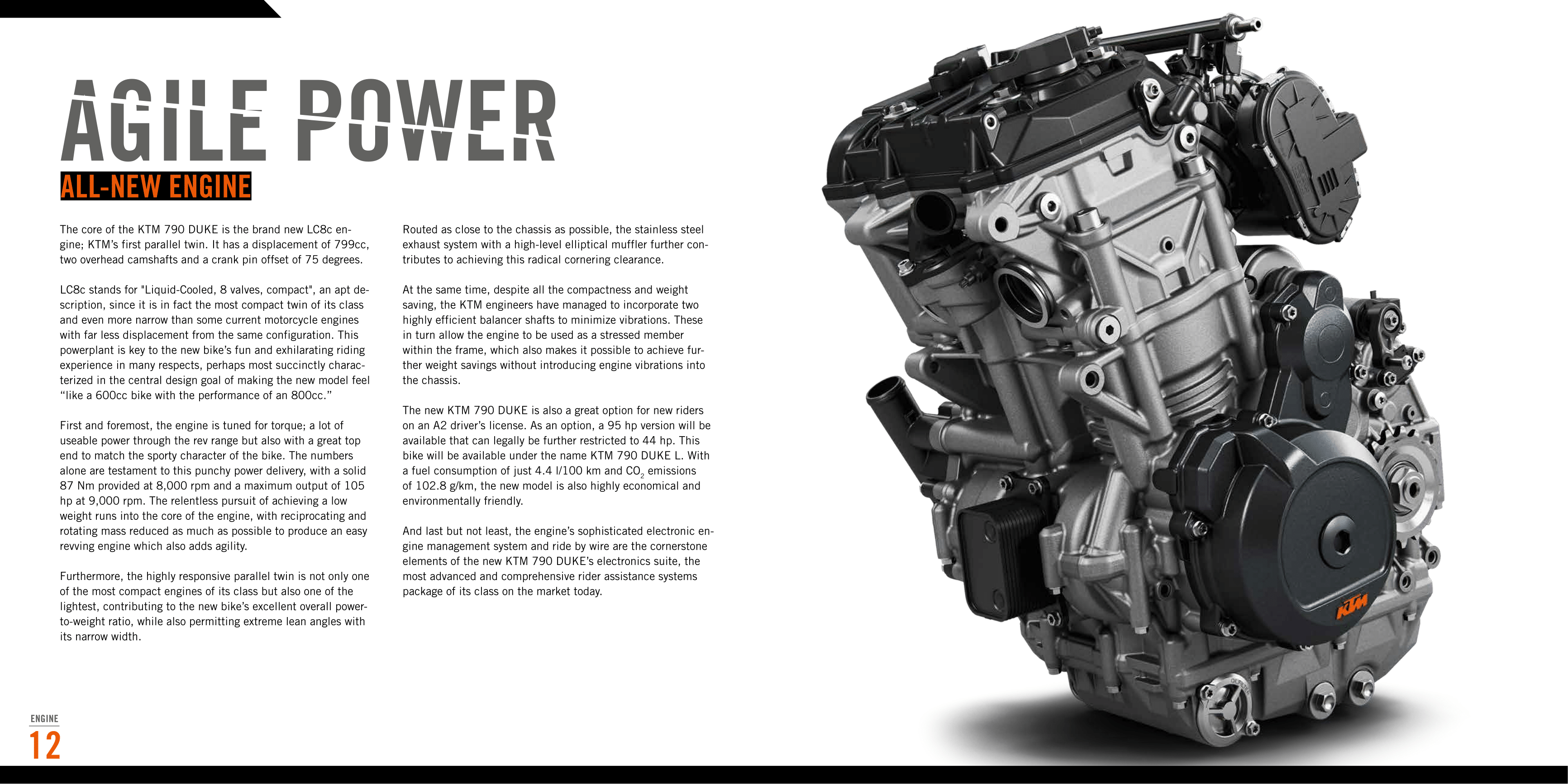 Kepada yang belum tahu, nadi jentera KTM ini ialah enjin daripada keluarga LC8 dengan rekaan terbaru; LC8c (c untuk compact/kompak) – 799cc dwi silinder sebaris DOHC 4-injap dengan aci engkol (crankshaft) pada sudut ofset 75°, memberikan karakteristik kuasa hampir sama dengan streetfighter buas KTM, 1290 Duke yang dijana enjin V-Twin 75°. Menurut KTM, enjin V-Twin hampir digunakan untuk 790 Duke ini, tetapi diubah kepada dwi-silinder sebaris untuk lebih kompak dan ekonomi.