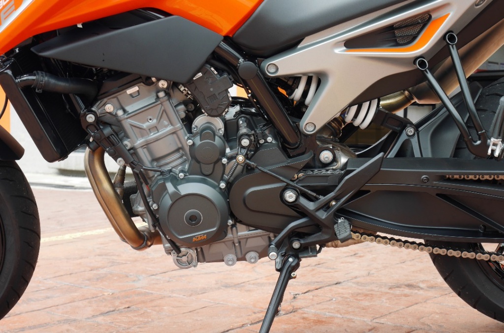 Jentera ini didatangkan dengan aci engkol bersudut ofset 75° yang memberikan karakter kuasa hampir sama seperti streetfighter KTM lebih buas, 1290 Duke, enjin V-Twin 75°. Menurut KTM, enjin V-Twin sebenarnya hampir saja digunakan 790 Duke, tetapi diubah kepada dwi silinder sebaris supaya lebih kompak dan ekonomi.