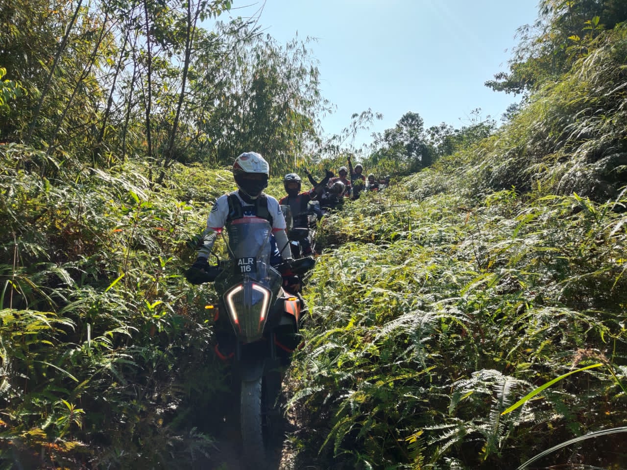 Kami akhirnya tiba di satu laluan sempit yang dibarisi hutan tebal. Ranting dan daun pokok langsung ‘menyebat’ muka kami. Di hujung laluan pula ada cerun curam yang memerlukan pusingan 90º ke kiri untuk mendaki. Beberapa penunggang terkandas di kaki bukit kerana terpaksa memanjat bonggol terdahulu sebelum mula mendaki. Selain itu, ada juga lurah hujan dalam.