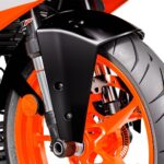 - Lampu depan jenis LED pada RC390 digantikan jenis reflektor halogen.