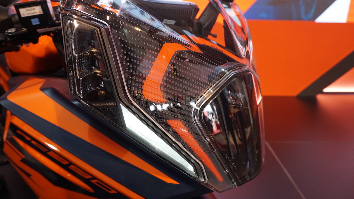 - Wajah hadapan RC390 menerima pembaharuan total yang lebih menarik, lampu utama jenis tunggal diposisikan di bahagian tengah dan diapit lampu siang (DRL) serta lampu signal belok yang diposisikan secara menegak.