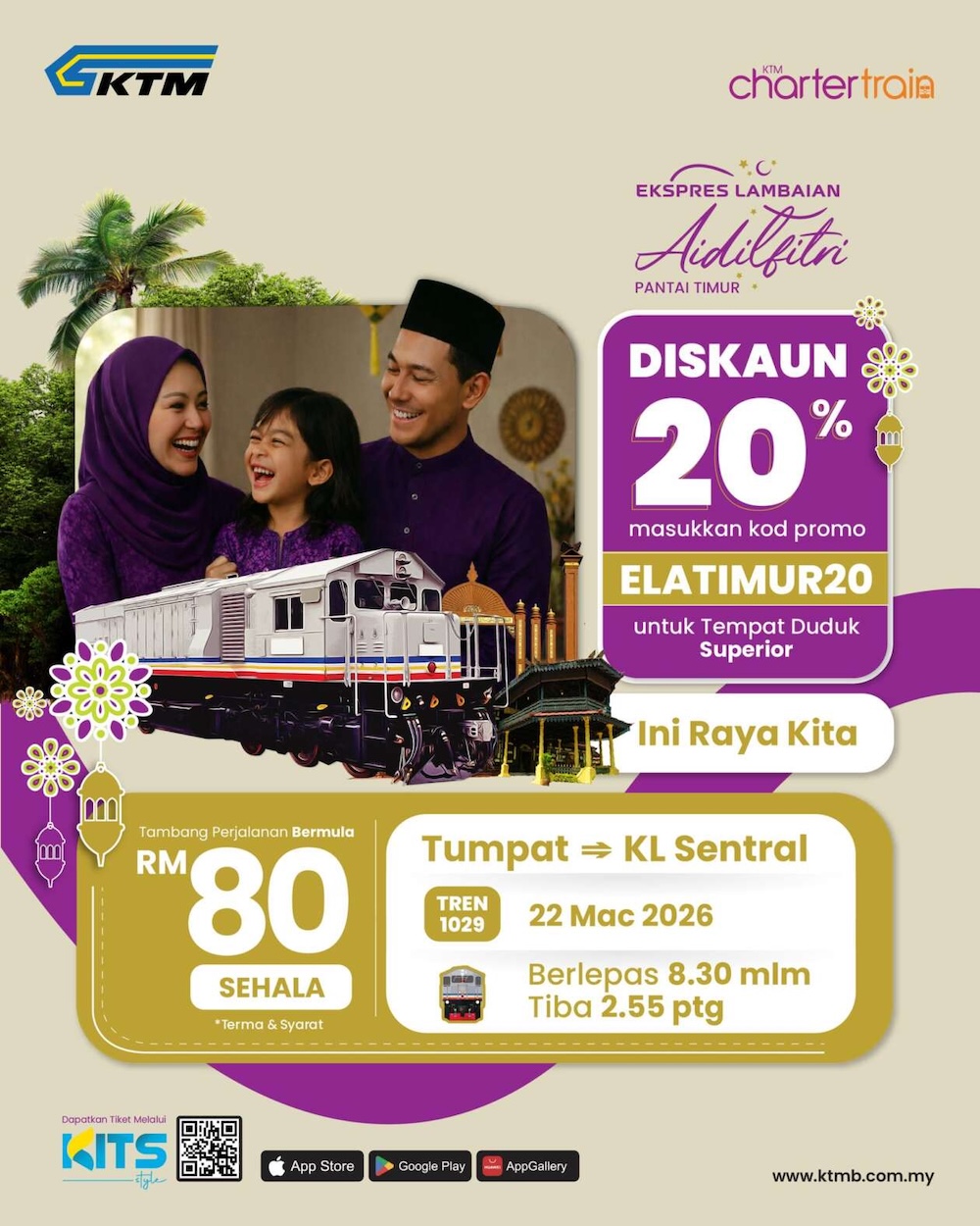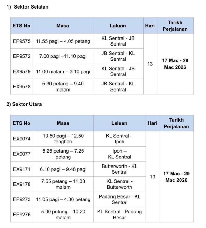 BERITA baik buat perantau yang merancang pulang ke kampung halaman menaiki tren sempena Aidilfitri 2026. Keretapi Tanah Melayu Berhad (KTM) mengumumkan penambahan 26 perkhidmatan khas bagi tempoh 17 hingga 29 Mac susulan permintaan tinggi dan jualan tiket sedia ada yang hampir habis.