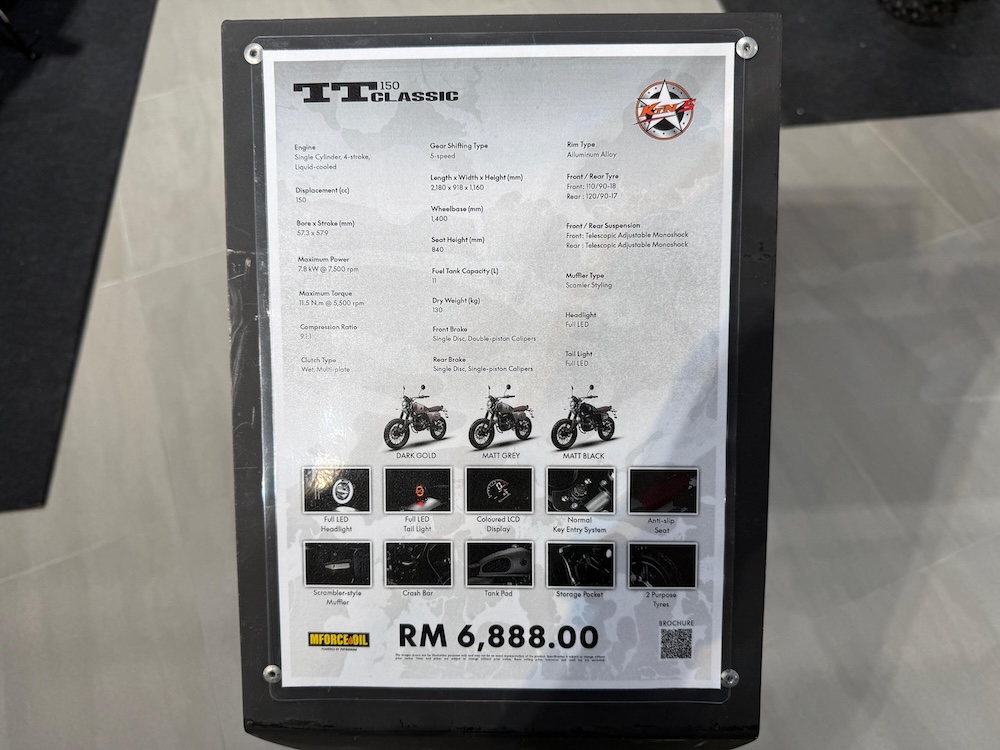 Model bergaya scrambler klasik ini ditawarkan pada harga RM6,888 (tidak termasuk cukai jalan dan insurans) dan hadir dengan tiga pilihan warna iaitu Dark Gold, Matt Black dan Matt Grey.