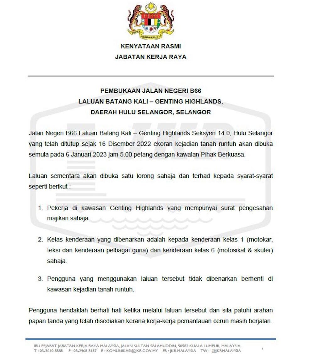 Sebelum ini, Jalan Negeri B66 itu ditutup berikutan insiden tanah runtuh. Jabatan Kerja Raya (JKR) dalam satu kenyataan menyatakan laluan tersebut kini dibuka dengan kawalan pihak berkuasa.