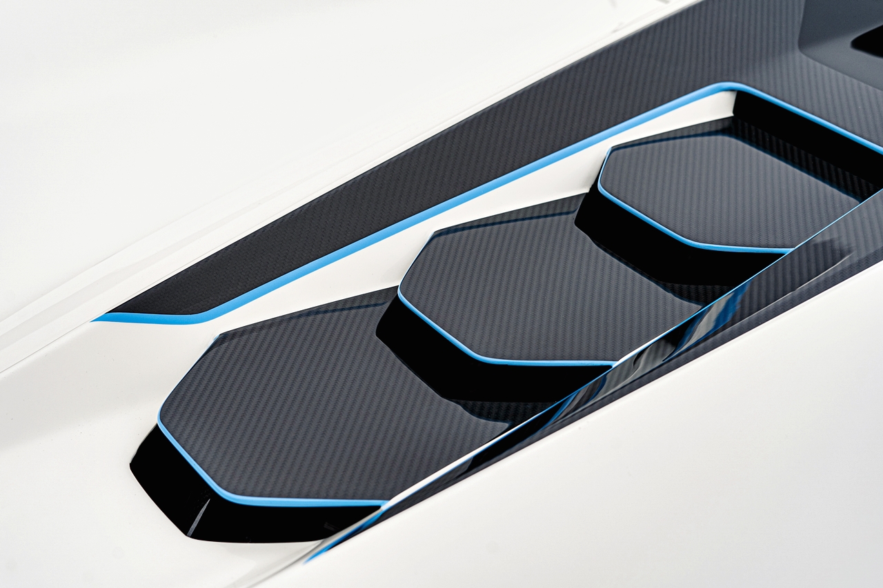 - Spliter depan dan diapit dua sirip dan saluran masukan udara pada bonet depan yang dipengaruhi Huracán GT3 EVO.