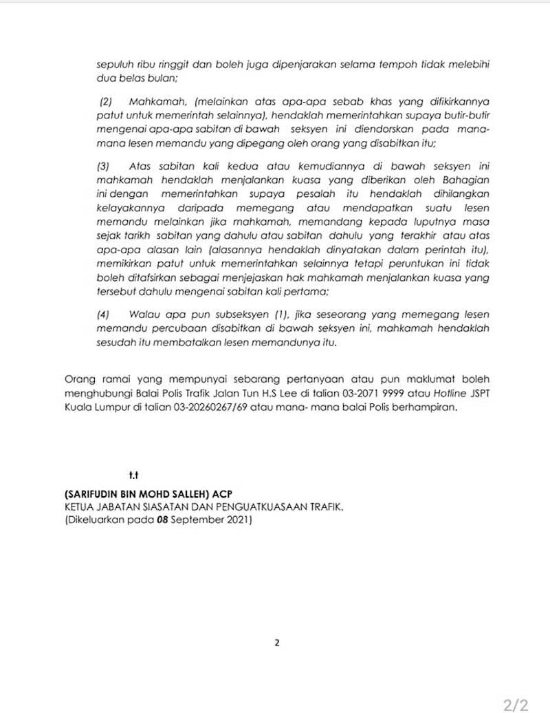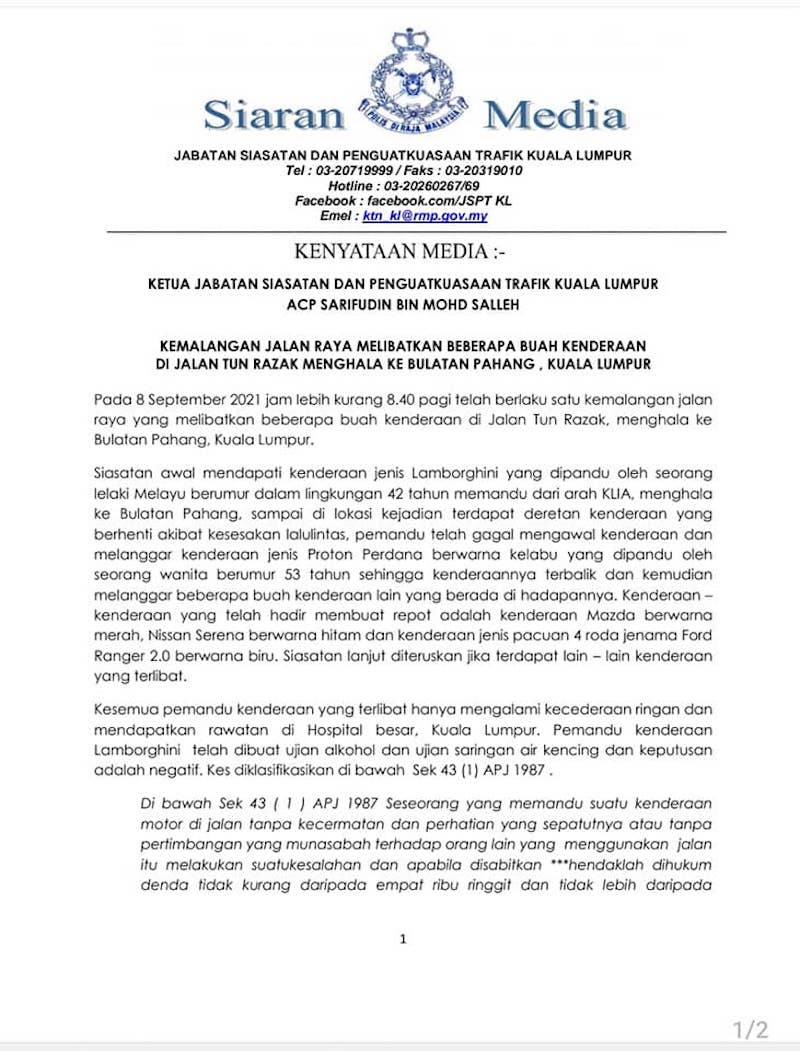 Pemandu Lamborghini sudah menjalani ujian saringan air kencing dan alkohol, keputusan adalah negatif. Kes itu diklasifikasikan di bawah Seksyen 43 (1) Akta Pengangkutan Jalan 1987.”