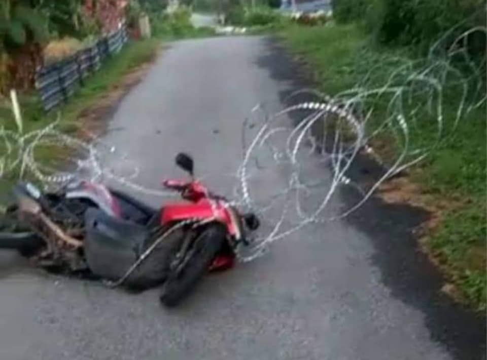 SEORANG penunggang motosikal di Ipoh cedera selepas melanggar kawat duri yang dipasangkan pihak berkuasa di Kampung Datuk Ahmad Said Tambahan 2, semalam. Mangsa juga didapati menunggang dalam keadaan mabuk.