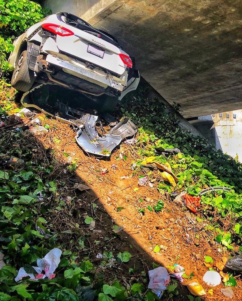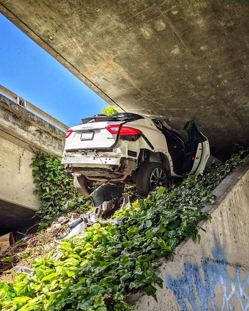 Maserati itu memandu keluar dari lebuh raya, dan tiba-tiba memanjat tebing sebelum merempuh bahagian bawah jejambat lebuh raya.”