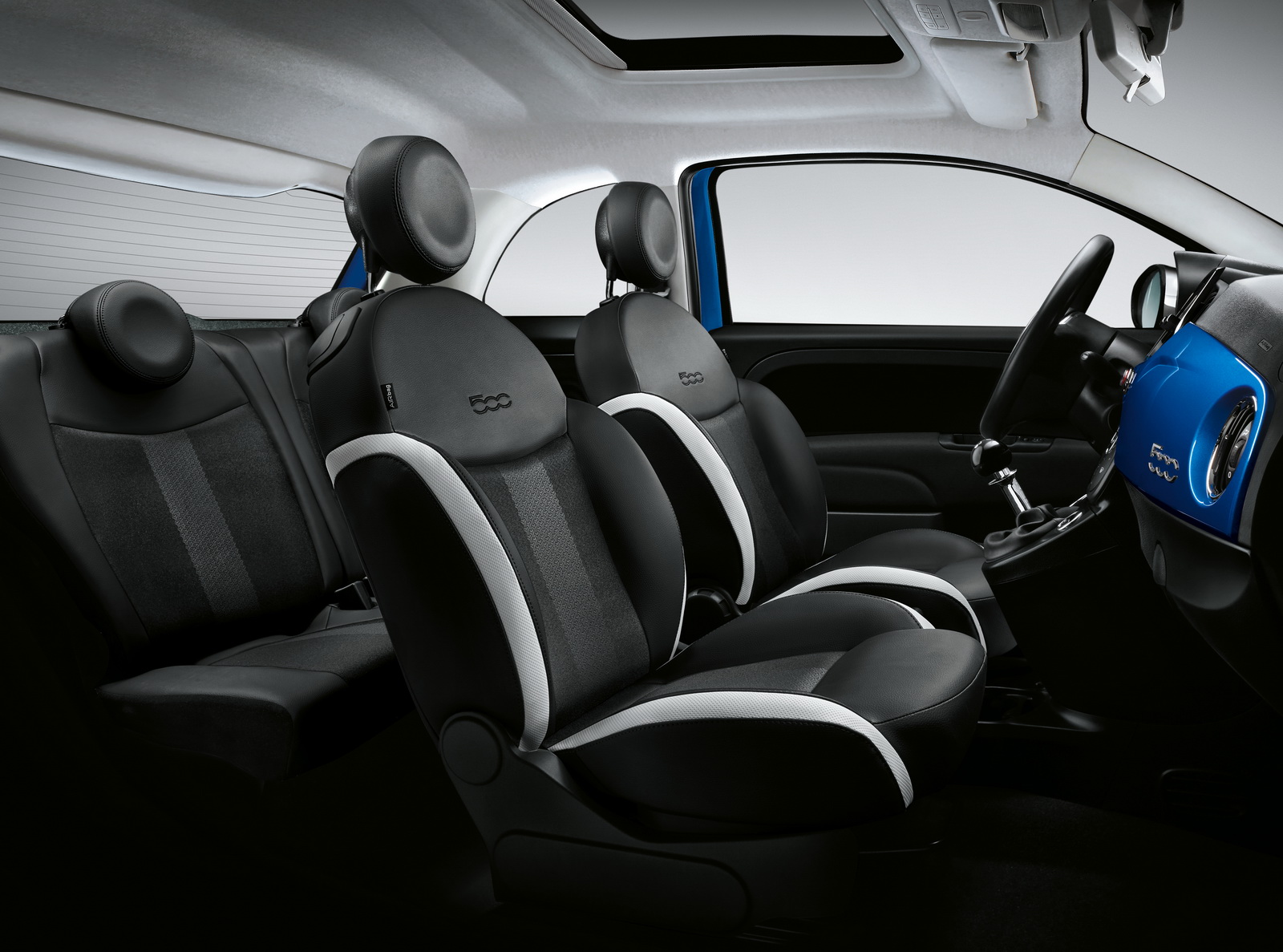 Akhir sekali 500L Mirror ditawarkan dalam warna biru terang unik dua tona, Venezia Blue dengan bumbung bercat kelabu Maestro Grey, dan dipadankan dengan perincian krom dan rim aloi 17-inci.