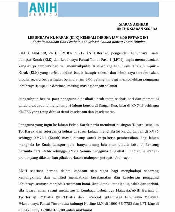 PENGENDALI Lebuh Raya Kuala Lumpur-Karak (KLK) dan Lebuh Raya Pantai Timur Fasa 1 (LPT1), ANIH Bhd memaklumkan semua laluan lebuh raya kini dibuka kepada semua kenderaan secara berperingkat bermula jam 6 petang, semalam.
