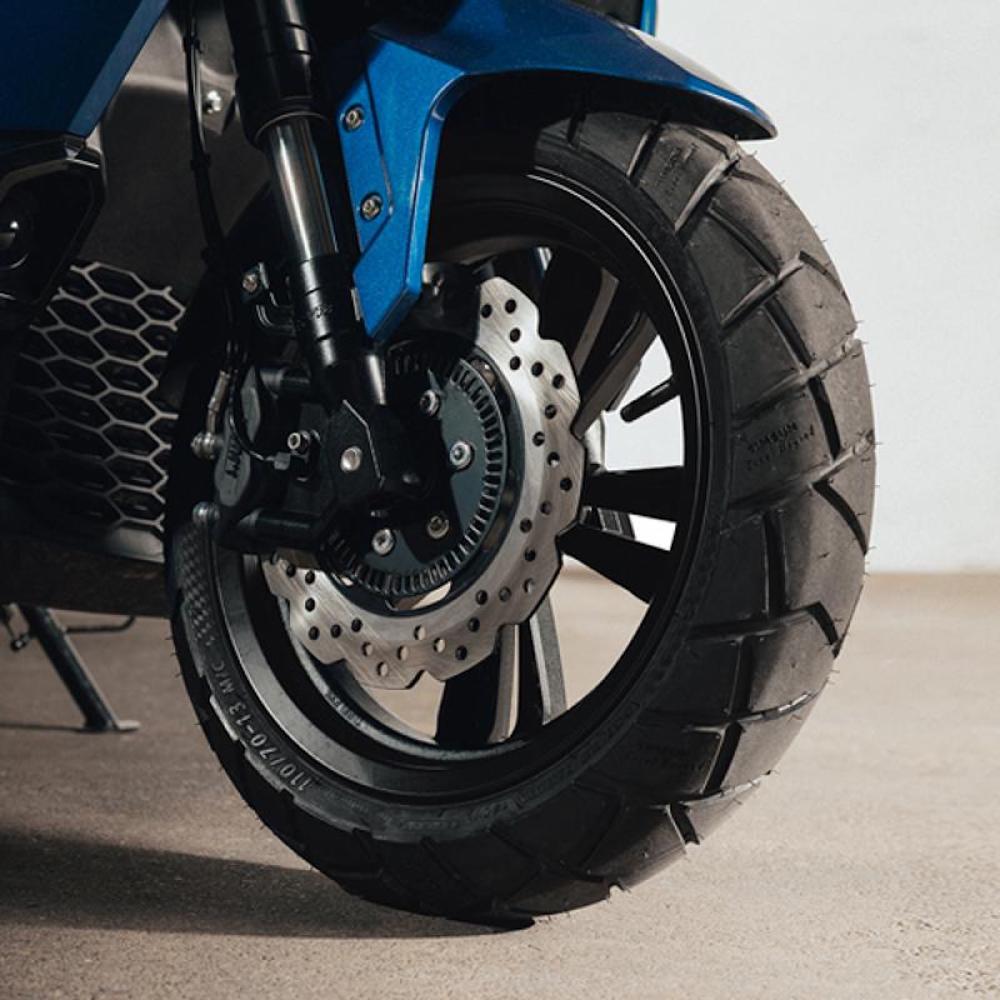 Skuter itu hadir dengan gaya badan maskular dari depan ke belakang, dan ditambah mufler ekzos besar serta rim 13 inci dengan profil tayar blok.