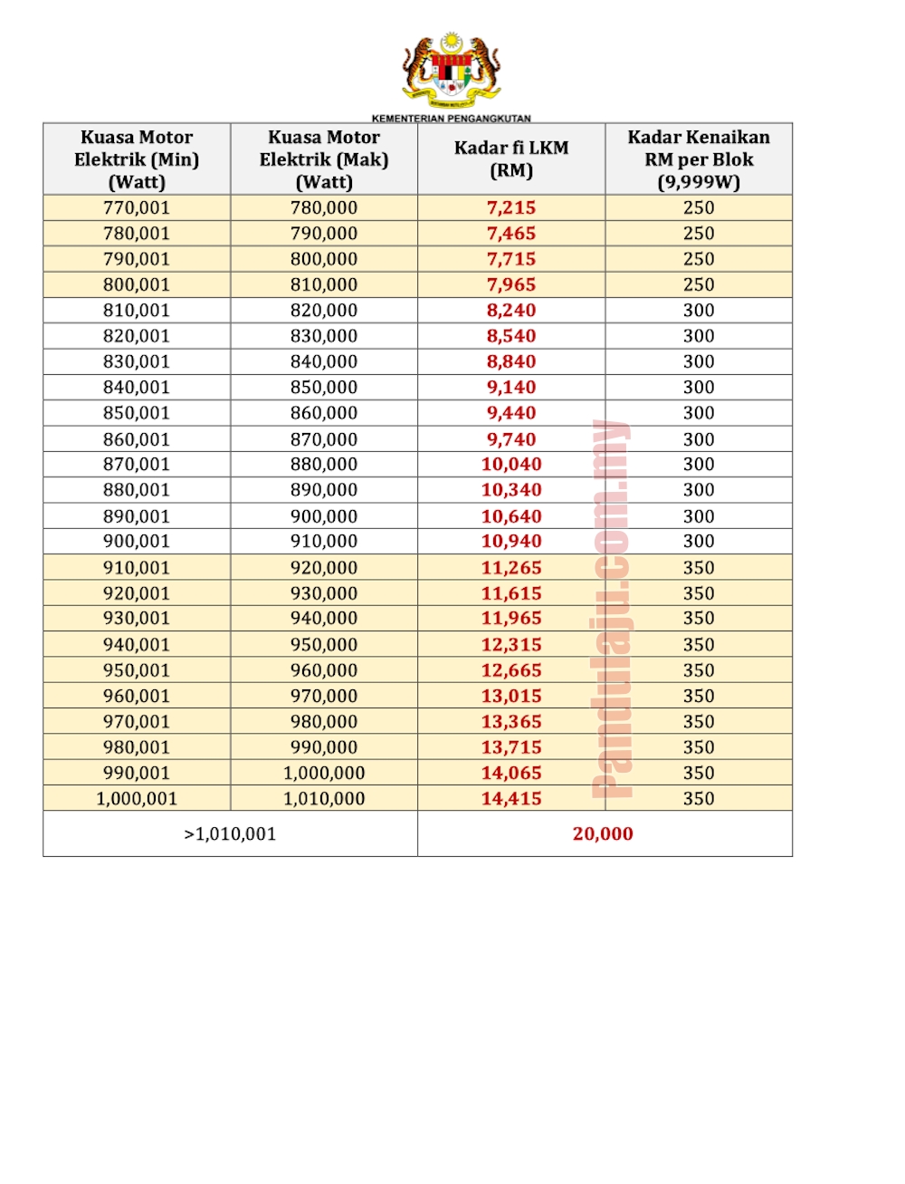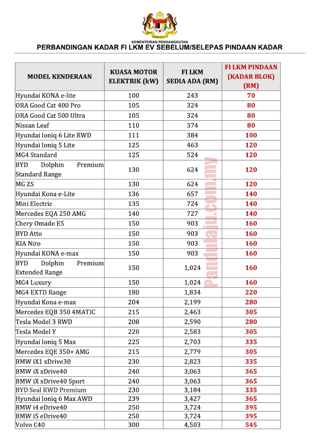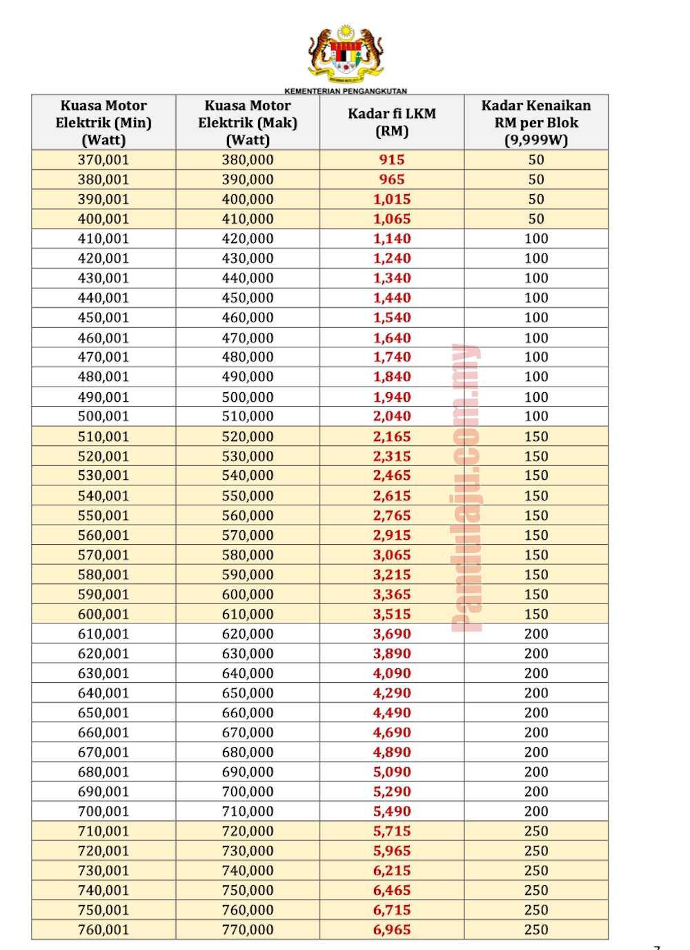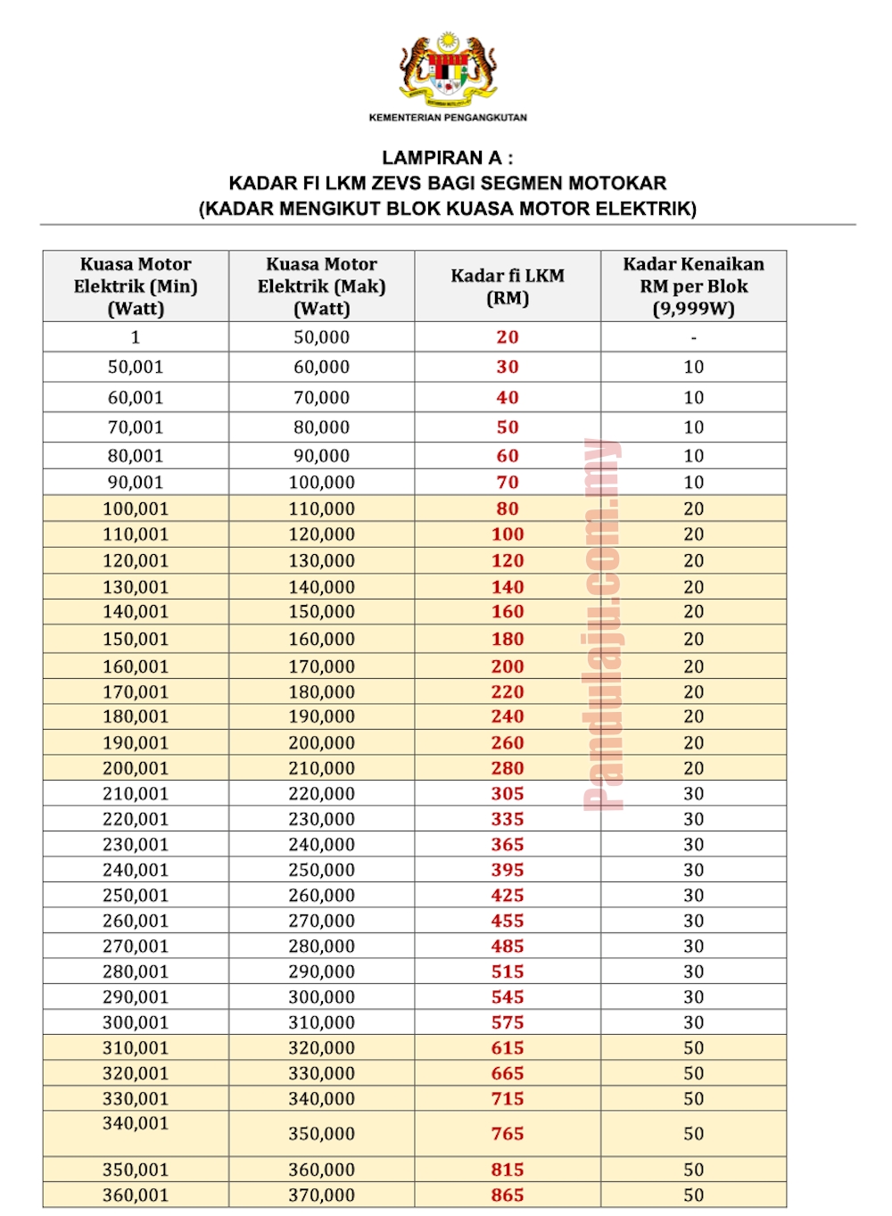 Berikut jadual kadar fi cukai jalan mengikut blok kuasa motor elektrik.