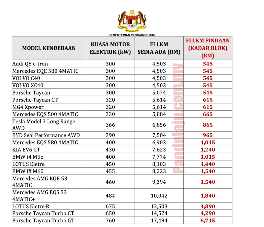 Ini pula senarai harga cukai jalan untuk kenderaan ZEV popular: