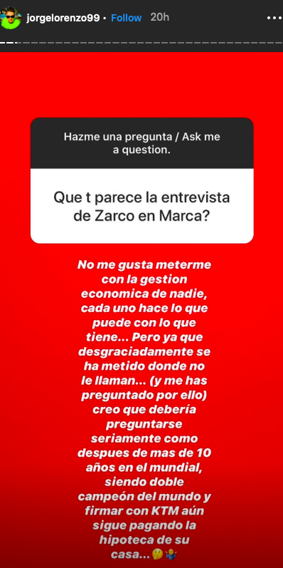 SUSULAN kenyataan dikeluarkan Johann Zarco, ada seorang peminat langsung bertanyakan isu tersebut kepada Jorge Lorenzo apabila pelumba bersara itu membuka sesi soalan ‘Ask Me a Question‘ menerusi Instastory dalam akaun Instagram.