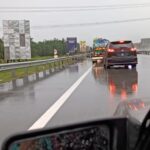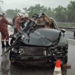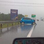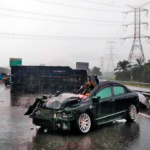 Kemalangan berlaku sekitar jam 8 pagi semalam dalam cuaca hujan lebat melibatkan sebuah lori dan dua kereta. Lori terbalik dan melintang menutupi sepenuhnya laluan kanan lebuh raya, manakala sebuah kereta hitam, dipercayai jenis Mazda, remuk teruk di belakang lori tersebut.