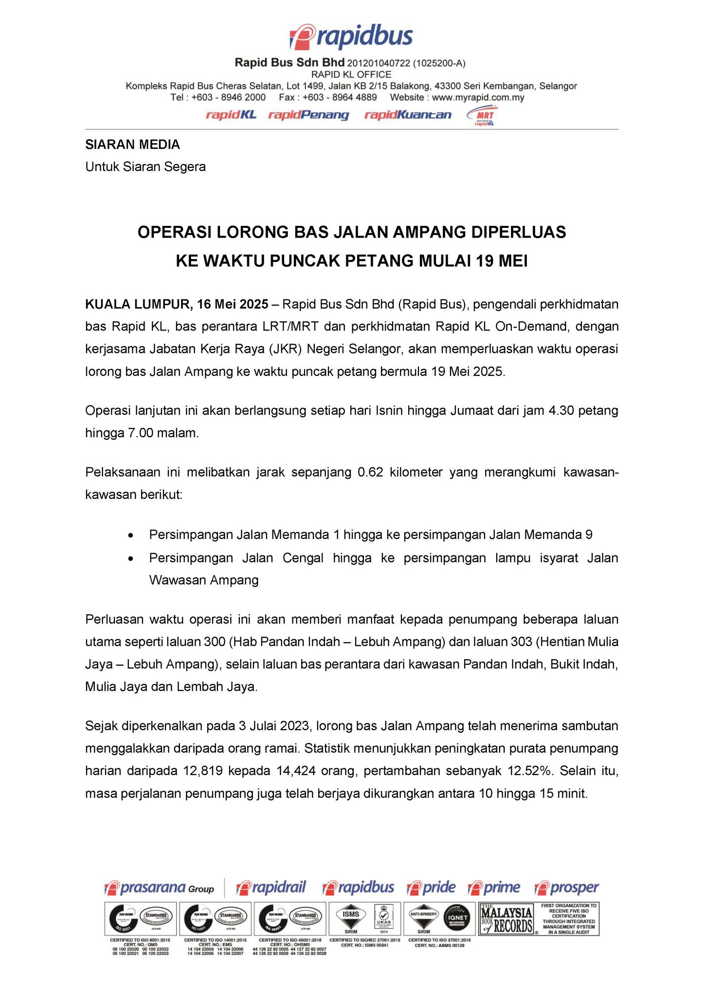 OPERASI lorong bas di Jalan Ampang akan dilanjutkan hingga waktu puncak petang bermula 19 Mei 2025 ini, melibatkan tempoh antara 4.30 petang hingga 7 malam setiap Isnin hingga Jumaat.
