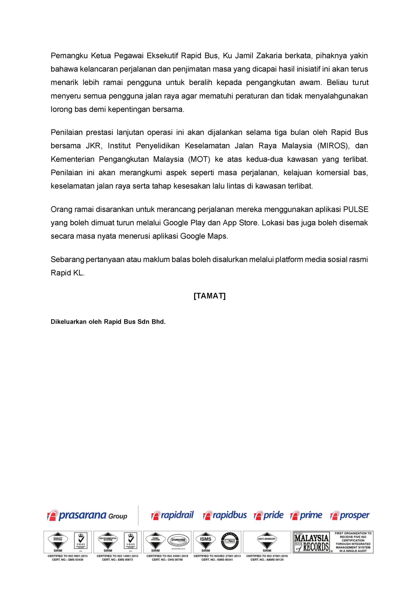 Pemangku Ketua Pegawai Eksekutif Rapid Bus, Ku Jamil Zakaria meminta semua pengguna jalan raya mematuhi peraturan dan tidak menyalah gunan lorong bas demi keselamatan dan kelancaran trafik. Beliau turut menekankan kepentingan kerjasama semua pihak bagi menjayakan pelaksanaan tersebut.
