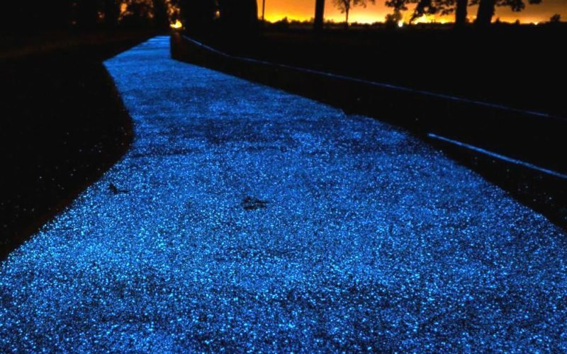 Partikel sintetik – dipanggil luminofores (luminophores) – digunakan untuk mengecaj asfalt dengan cahaya matahari sebelum mengeluarkan cahaya biru menjelang malam atau cuaca gelap.