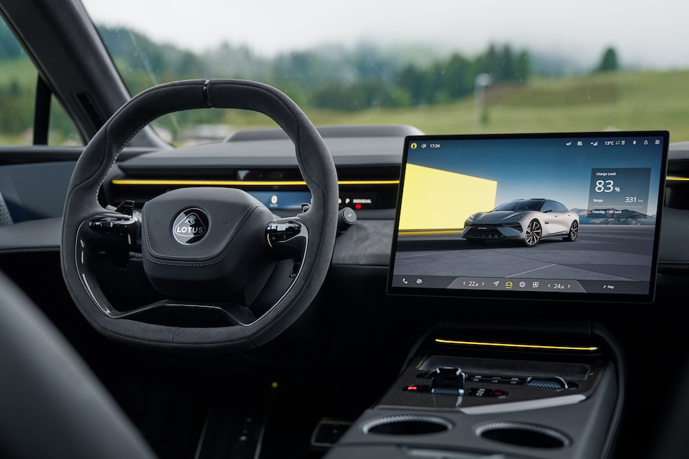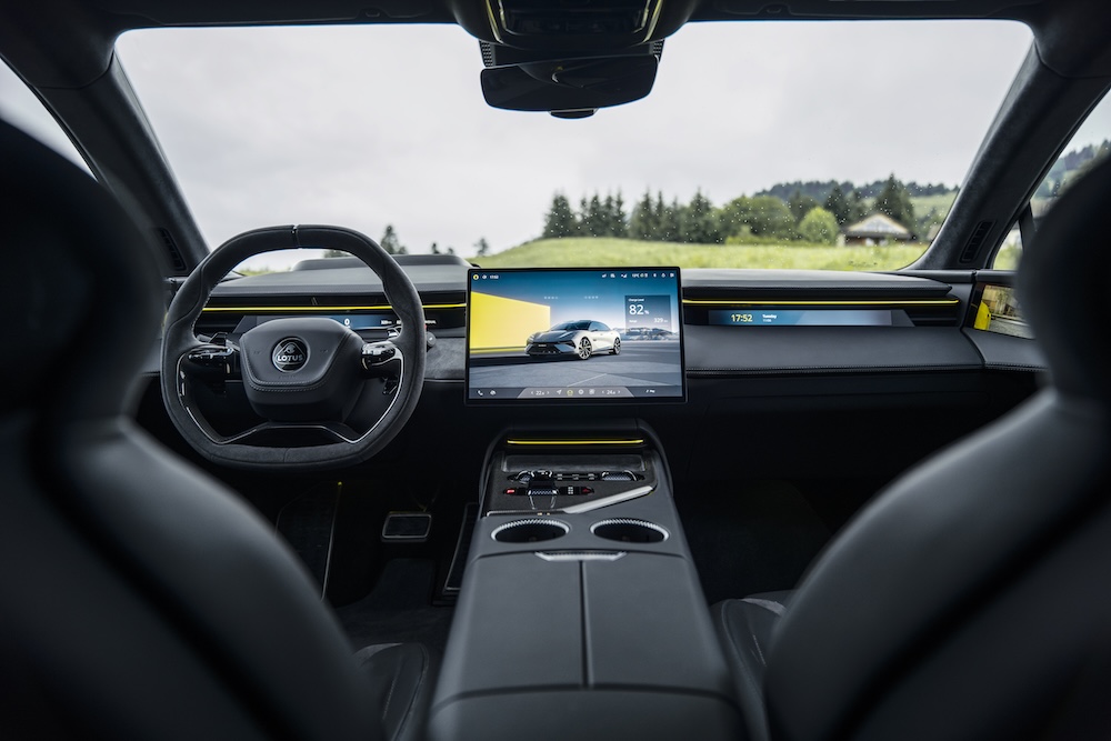 Bahagian kabin menggabungkan teknologi terkini dengan material mewah seperti fabrik prestasi mampan LotusWear untuk suasana pemanduan eksklusif dan mesra alam.