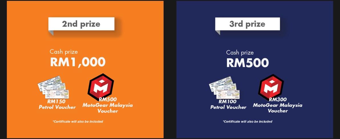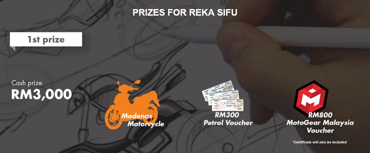 Hadiah utama adalah berupa sebuah motosikal Modenas selain wang tunai dan baucar petrol berserta aksesori motosikal daripada Moto Gear Malaysia untuk pemenang tempat kedua dan ketiga. Tunggu apa lagi! Klik SINI untuk menyertai REKA SIFU.