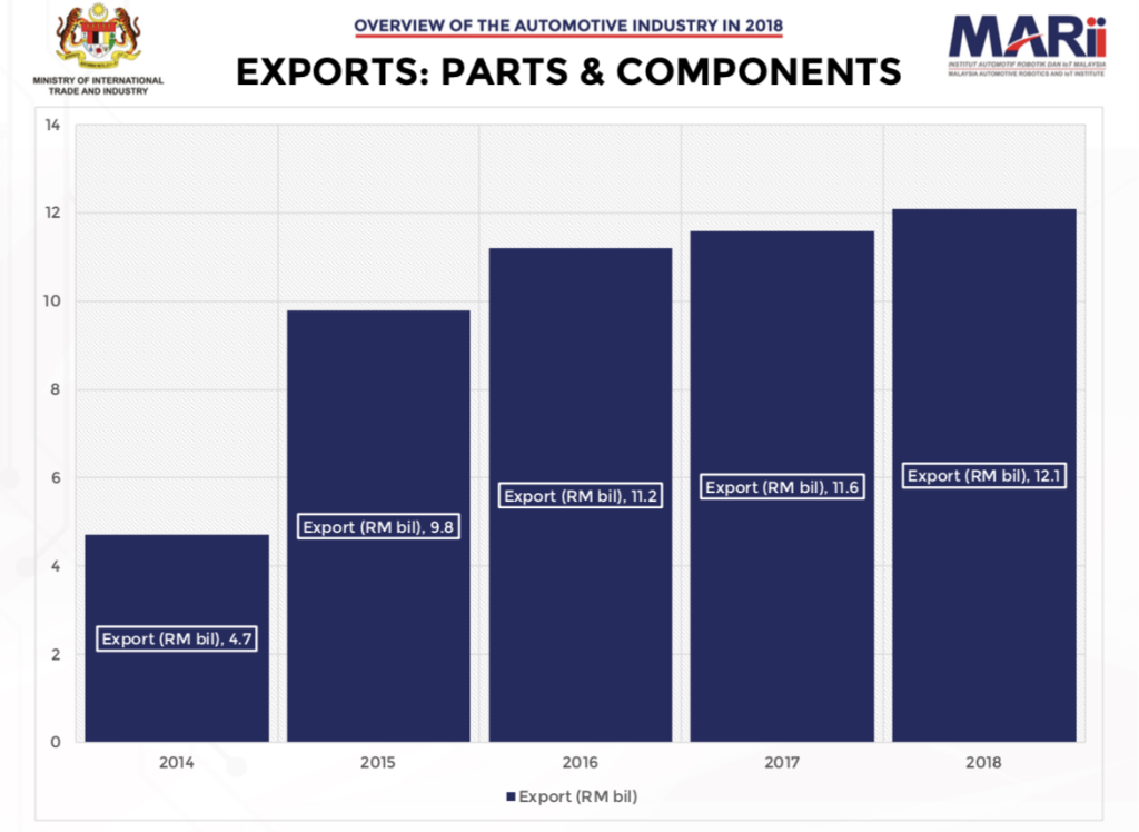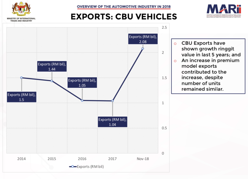 - Eksport kenderaan import (CBU) meningkat RM2 bilion (2018) selepas menunjukkan penurunan pada 2017. Pasaran CBU dilihat mampu memberikan pulangan positif lebih besar bagi 2019 dan masa depan.