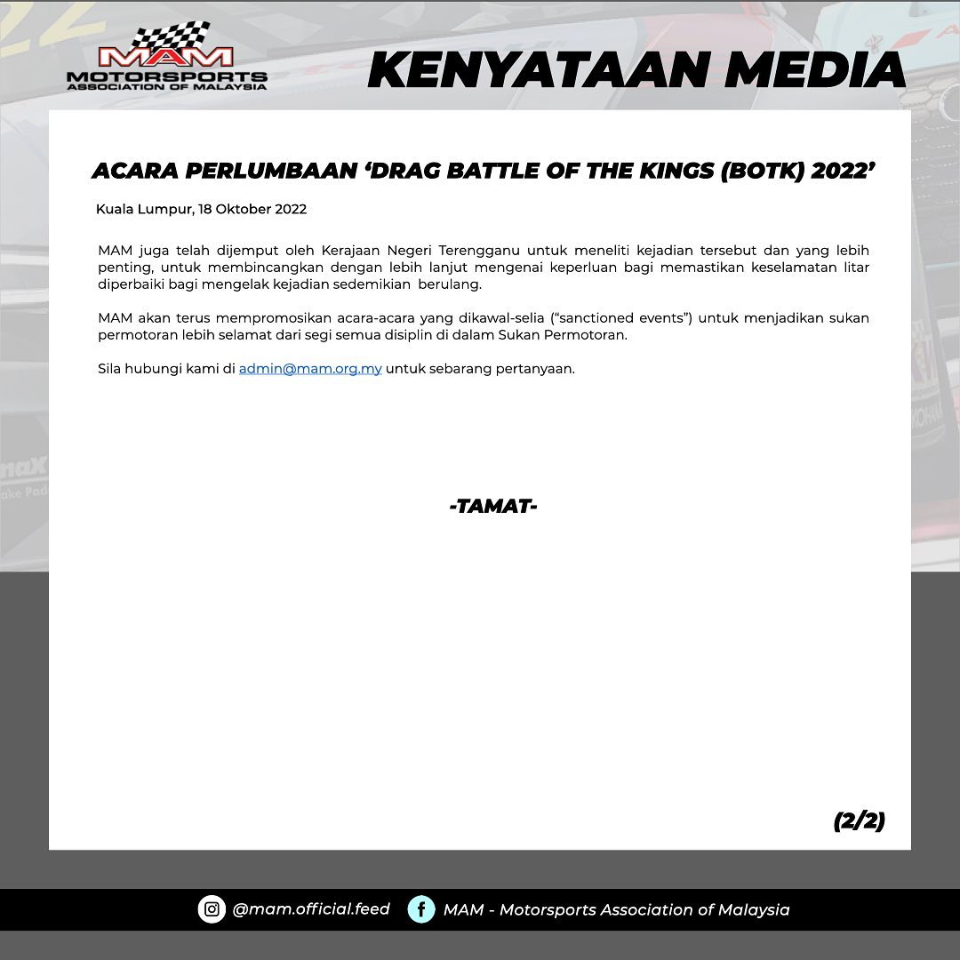 Perkara itu diumumkan MAM dalam kenyataan di laman Facebook yang dibuat selepas seorang peserta Muhamad Hafez Jamal Jamaludin (Apeh Jamal) maut dalam kemalangan pada acara BOTK 2022.