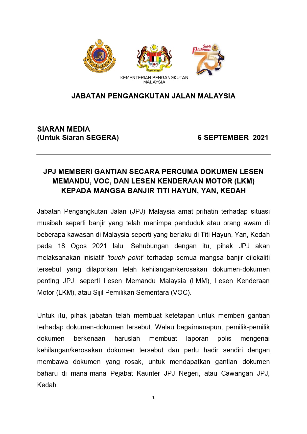 JABATAN Pengangkutan Jalan (JPJ) hari ini mengumumkan inisiatif menggantikan dokumen rosak khas buat mangsa banjir di Titi Hayun, Yan, Kedah melibat dokuman rosak seperti berikut: