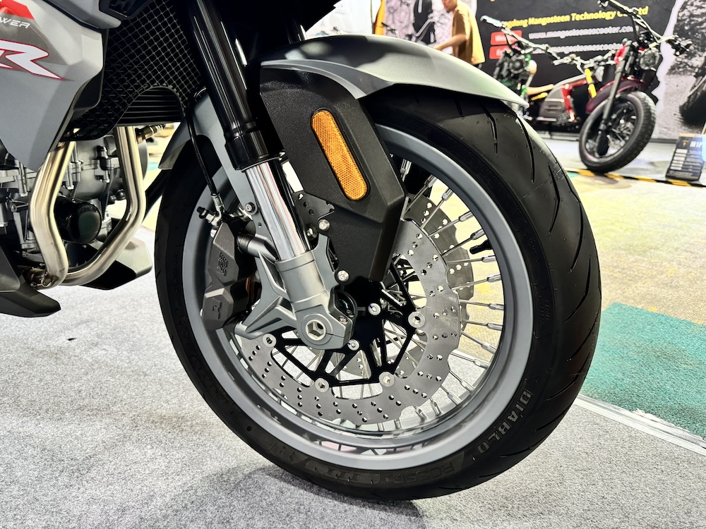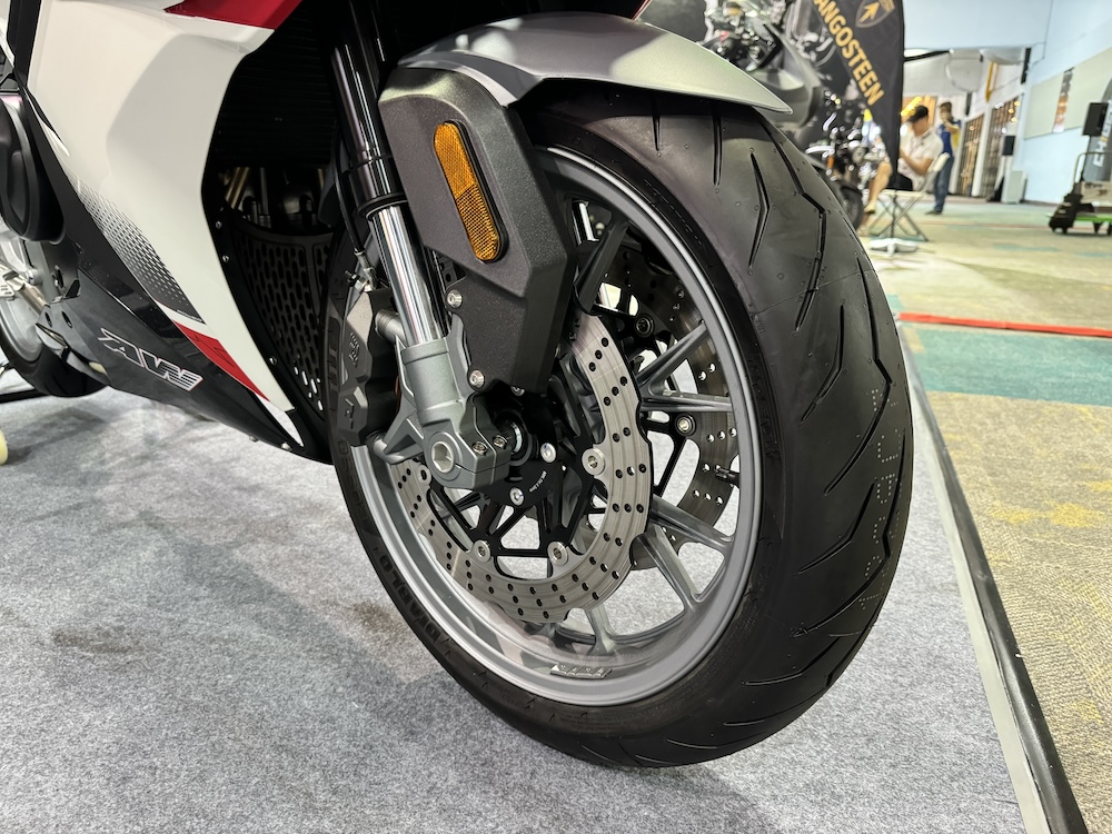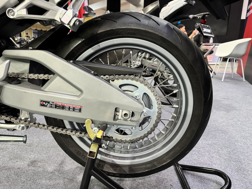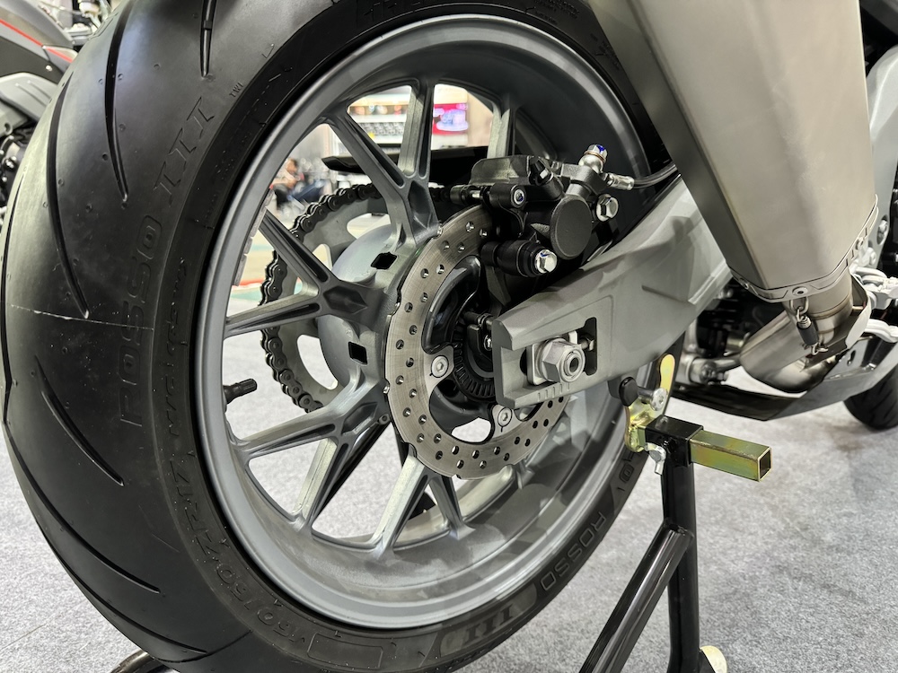 - Rim aloi 17 inci dengan tayar 120/70 (depan) dan 160/60 (belakang). Jenama tayar Pirelli Diablo Rosso III.