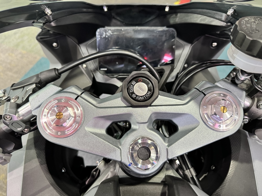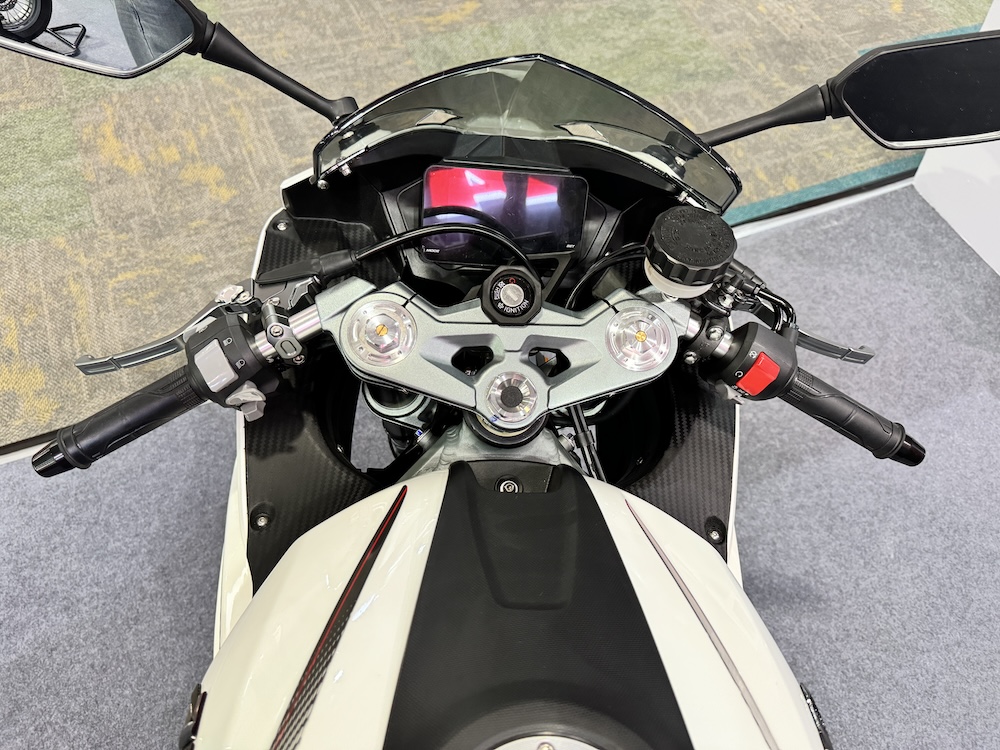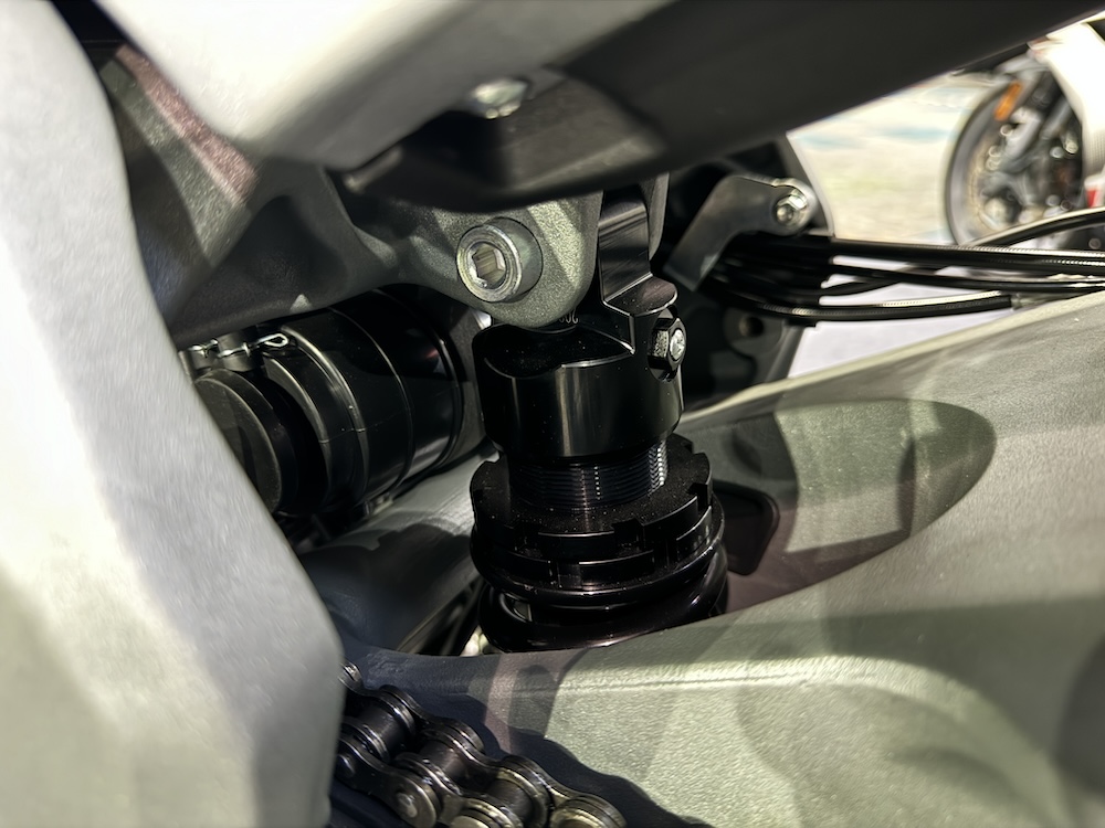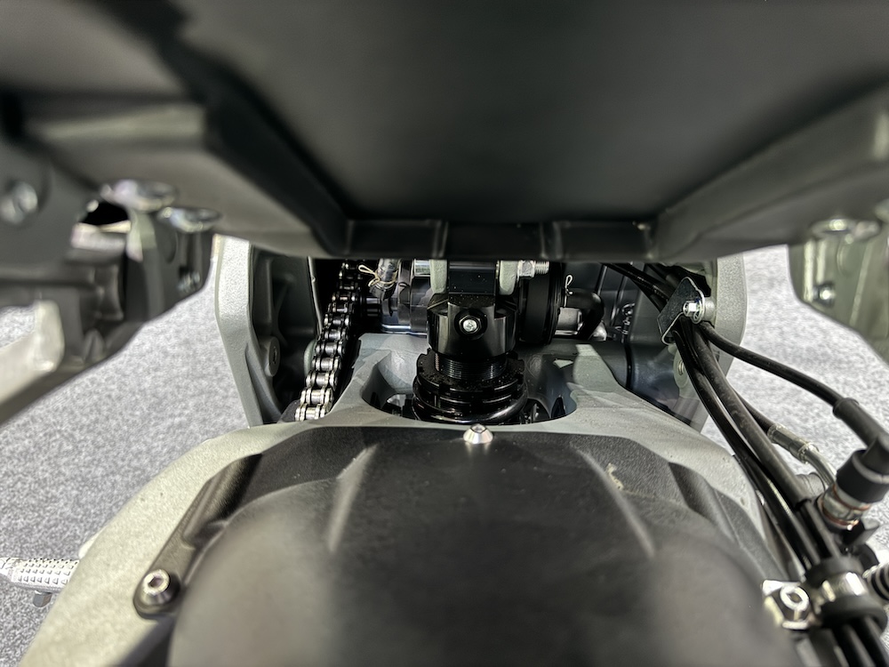 - Fork terbalik 41mm di depan dan monoshock di belakang, kedua-dua boleh laras.